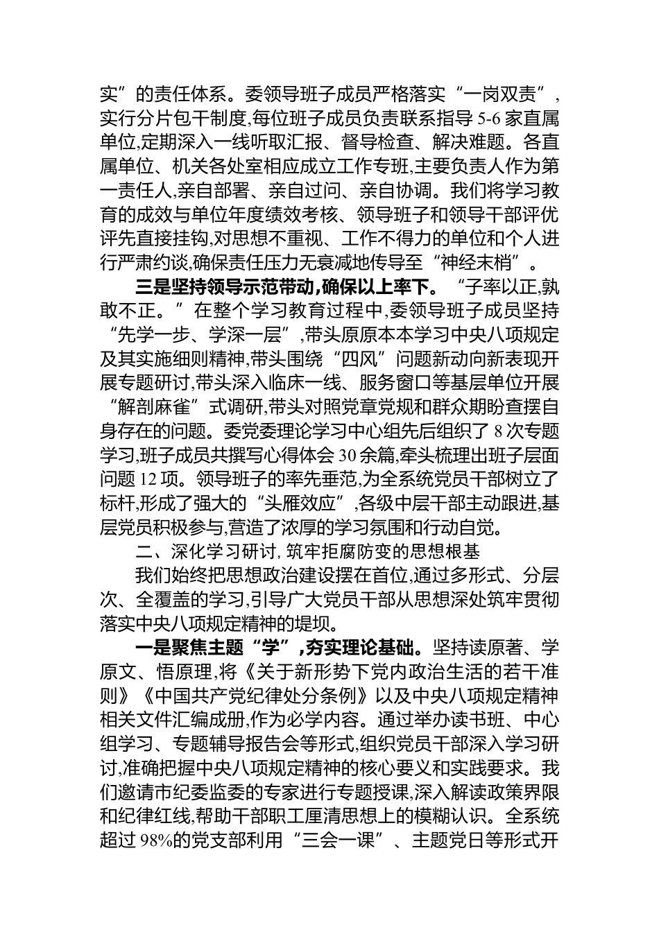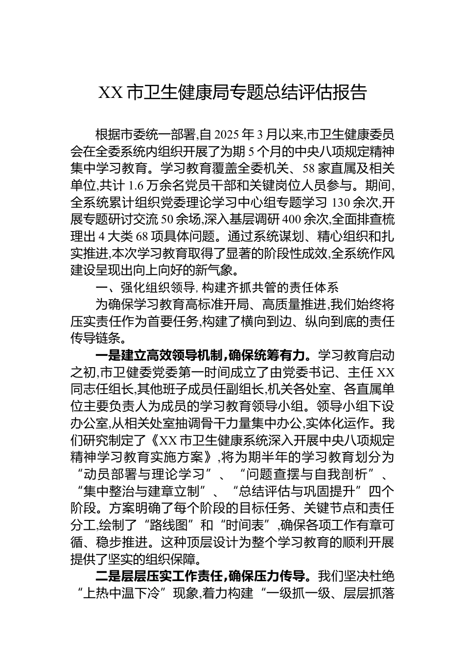 XX市衛(wèi)生健康局專題總結(jié)評估報告根據(jù)市委統(tǒng)一部署,自2025年3月以來,市衛(wèi)生健康委員會在全委系統(tǒng)內(nèi)組織開展了為期5個月的中央八項規(guī)定精神集中學習教育。學習教育覆蓋全委機關(guān)、58家直屬及相關(guān)單位,共計1.6萬余名黨員干部和關(guān)鍵崗位人員參與。期間,全系統(tǒng)累計組織黨委理論學習中心組專題學習130余次,開展專題研討交流50余場,深入基層調(diào)研400余次,全面排查梳理出4大類68項具體問題。通過系統(tǒng)謀劃、精心組織和扎實推進,本次學習教育取得了顯著的階段性成效,全系統(tǒng)作風建設(shè)呈現(xiàn)出向上向好的新氣象。一、強化組織領(lǐng)導,構(gòu)建齊抓共管的責任體系為確保學習教育高標準開局、高質(zhì)量...