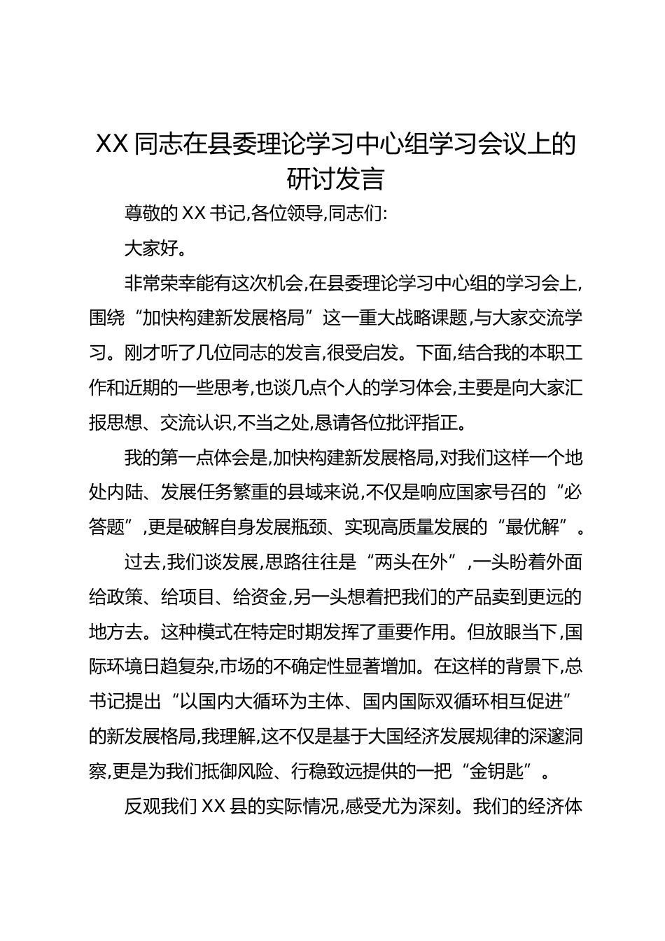 XX同志在縣委理論學(xué)習中心組學(xué)習會議上的研討發(fā)言尊敬的XX書記,各位領(lǐng)導(dǎo),同志們:大家好。非常榮幸能有這次機會,在縣委理論學(xué)習中心組的學(xué)習會上,圍繞“加快構(gòu)建新發(fā)展格局”這一重大戰(zhàn)略課題,與大家交流學(xué)習。剛才聽了幾位同志的發(fā)言,很受啟發(fā)。下面,結(jié)合我的本職工作和近期的一些思考,也談幾點個人的學(xué)習體會,主要是向大家匯報思想、交流認識,不當之處,懇請各位批評指正。我的第一點體會是,加快構(gòu)建新發(fā)展格局,對我們這樣一個地處內(nèi)陸、發(fā)展任務(wù)繁重的縣域來說,不僅是響應(yīng)國家號召的“必答題”,更是破解自身發(fā)展瓶頸、實現(xiàn)高質(zhì)量發(fā)展的“最優(yōu)解”。過去,我們談發(fā)展,思路...