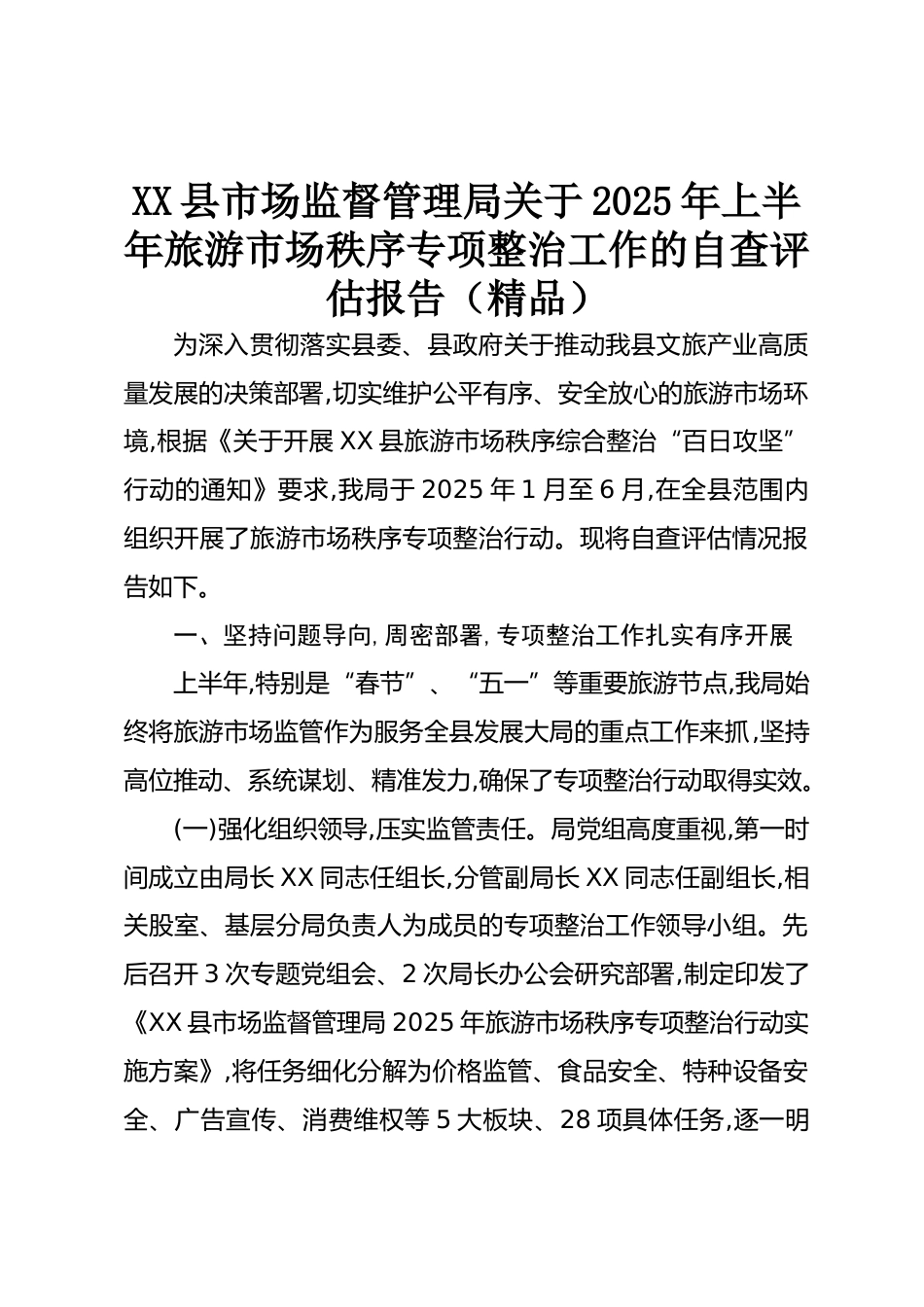 XX縣市場(chǎng)監(jiān)督管理局關(guān)于2025年上半年旅游市場(chǎng)秩序?qū)m?xiàng)整治工作的自查評(píng)估報(bào)告(精品)