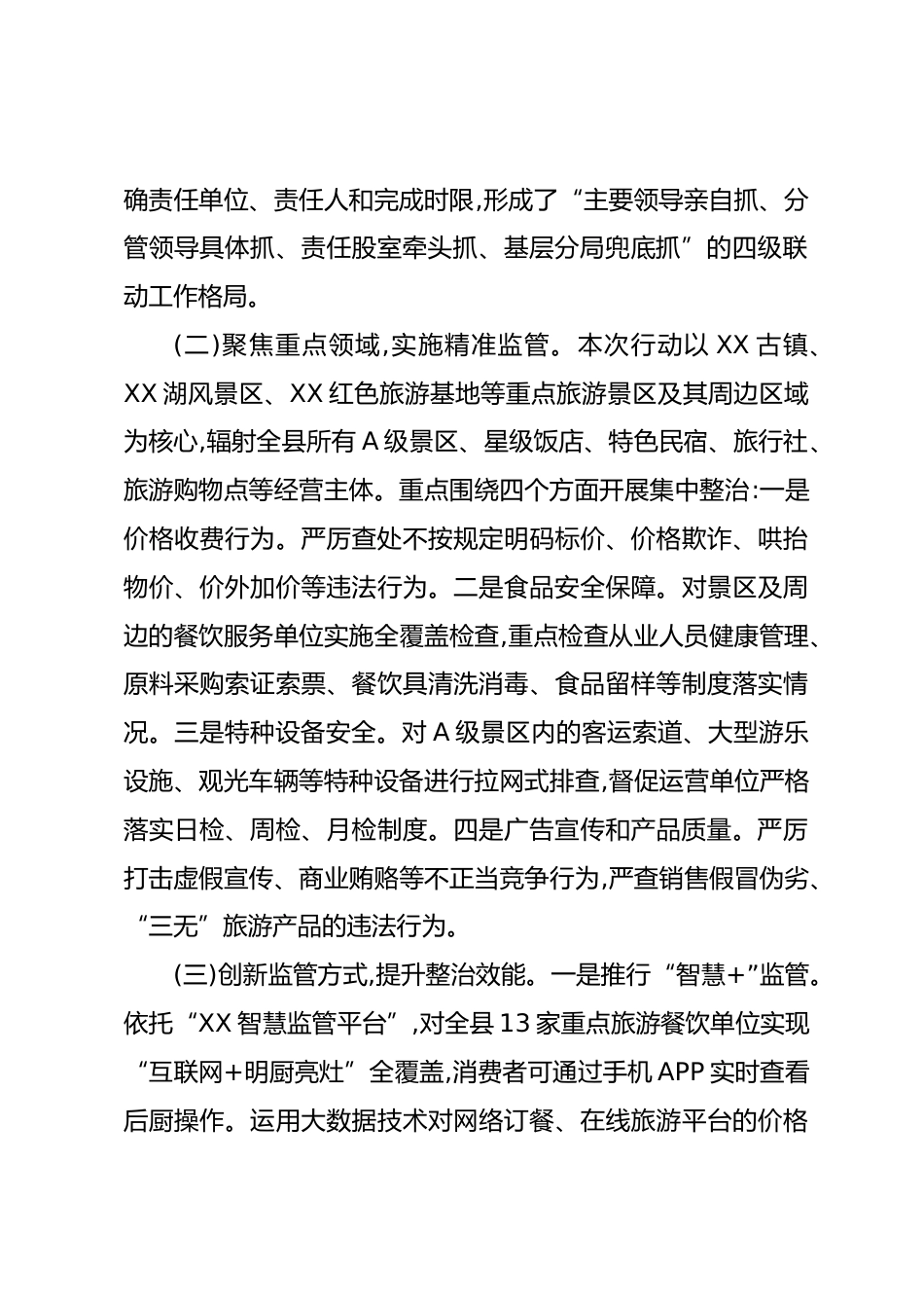 XX縣市場(chǎng)監(jiān)督管理局關(guān)于2025年上半年旅游市場(chǎng)秩序?qū)m?xiàng)整治工作的自查評(píng)估報(bào)告(精品)為深入貫徹落實(shí)縣委、縣政府關(guān)于推動(dòng)我縣文旅產(chǎn)業(yè)高質(zhì)量發(fā)展的決策部署,切實(shí)維護(hù)公平有序、安全放心的旅游市場(chǎng)環(huán)境,根據(jù)《關(guān)于開展XX縣旅游市場(chǎng)秩序綜合整治“百日攻堅(jiān)”行動(dòng)的通知》要求,我局于2025年1月至6月,在全縣范圍內(nèi)組織開展了旅游市場(chǎng)秩序?qū)m?xiàng)整治行動(dòng)?,F(xiàn)將自查評(píng)估情況報(bào)告如下。一、堅(jiān)持問題導(dǎo)向,周密部署,專項(xiàng)整治工作扎實(shí)有序開展上半年,特別是“春節(jié)”、“五一”等重要旅游節(jié)點(diǎn),我局始終將旅游市場(chǎng)監(jiān)管作為服務(wù)全縣發(fā)展大局的重點(diǎn)工作來抓,堅(jiān)持高位推動(dòng)、系統(tǒng)謀劃、精...