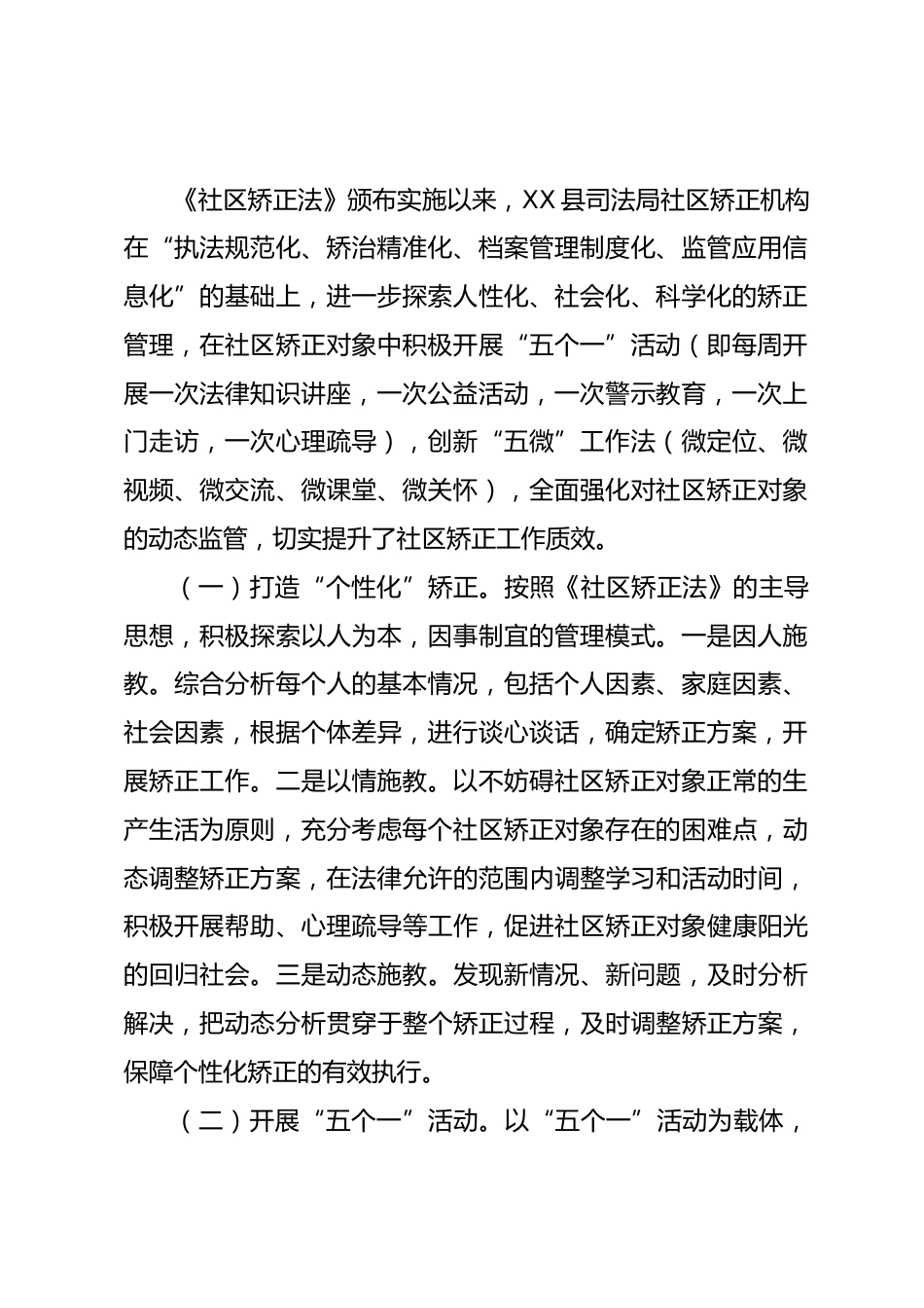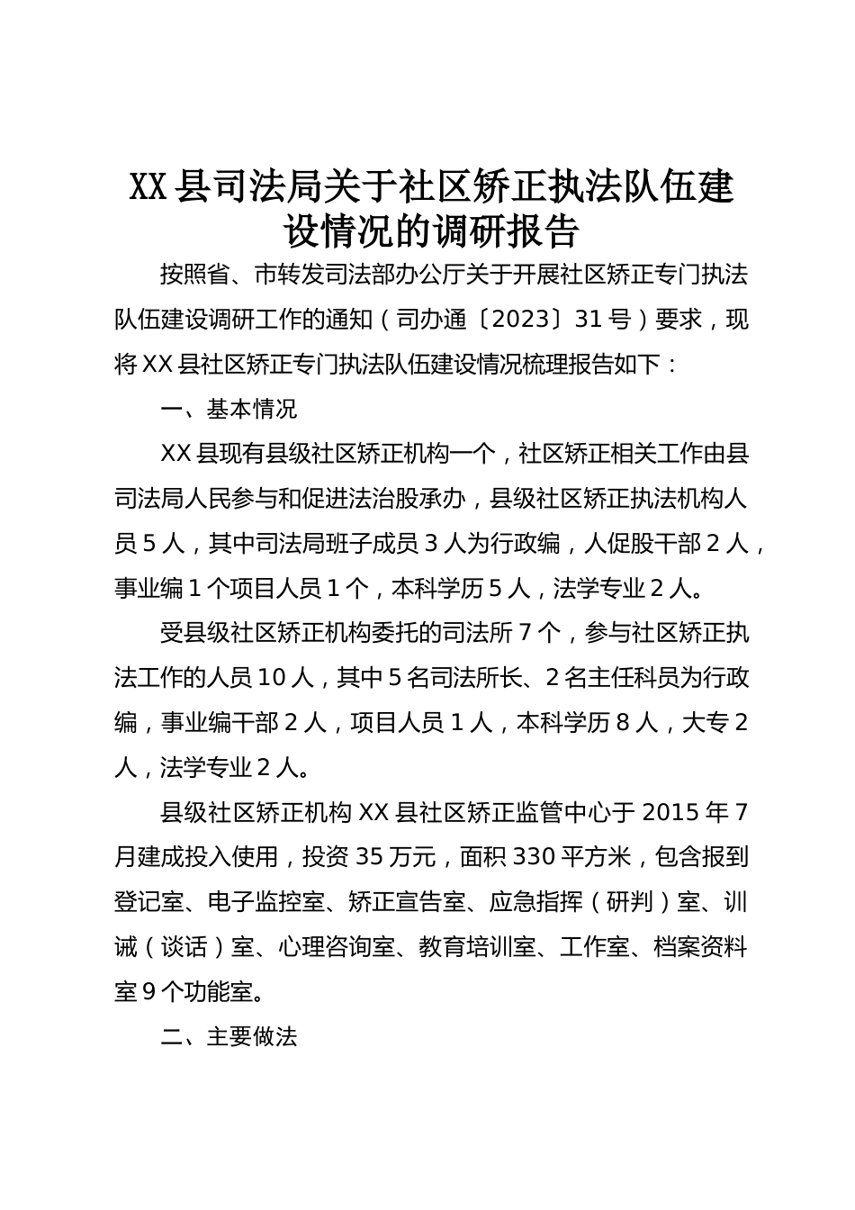 XX縣司法局關(guān)于社區(qū)矯正執(zhí)法隊(duì)伍建設(shè)情況的調(diào)研報(bào)告按照省、市轉(zhuǎn)發(fā)司法部辦公廳關(guān)于開展社區(qū)矯正專門執(zhí)法隊(duì)伍建設(shè)調(diào)研工作的通知(司辦通〔2023〕31號)要求,現(xiàn)將XX縣社區(qū)矯正專門執(zhí)法隊(duì)伍建設(shè)情況梳理報(bào)告如下:一、基本情況XX縣現(xiàn)有縣級社區(qū)矯正機(jī)構(gòu)一個(gè),社區(qū)矯正相關(guān)工作由縣司法局人民參與和促進(jìn)法治股承辦,縣級社區(qū)矯正執(zhí)法機(jī)構(gòu)人員5人,其中司法局班子成員3人為行政編,人促股干部2人,事業(yè)編1個(gè)項(xiàng)目人員1個(gè),本科學(xué)歷5人,法學(xué)專業(yè)2人。受縣級社區(qū)矯正機(jī)構(gòu)委托的司法所7個(gè),參與社區(qū)矯正執(zhí)法工作的人員10人,其中5名司法所長、2名主任科員為行政編,事業(yè)編干部...