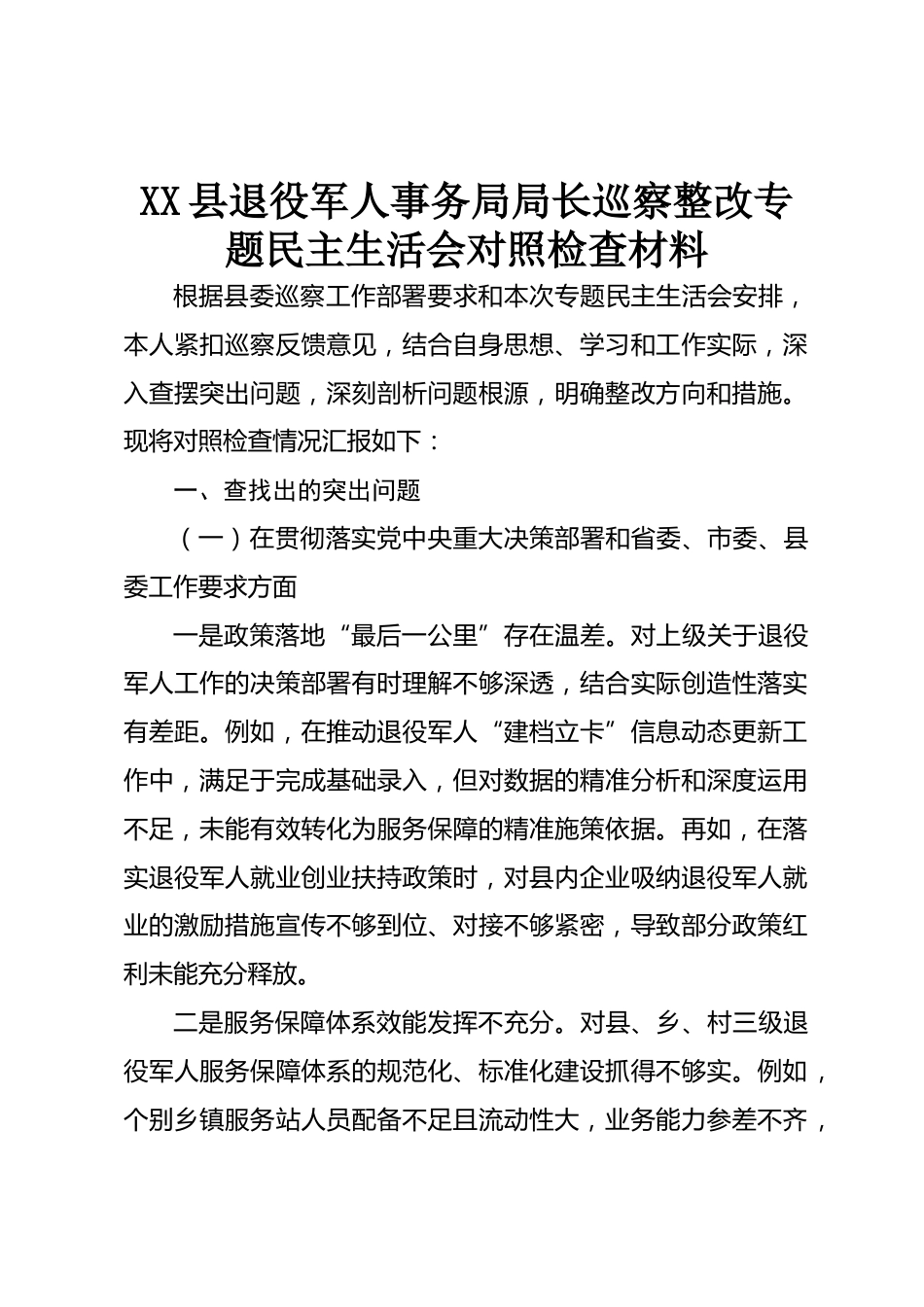 XX縣退役軍人事務局局長巡察整改專題民主生活會對照檢查材料