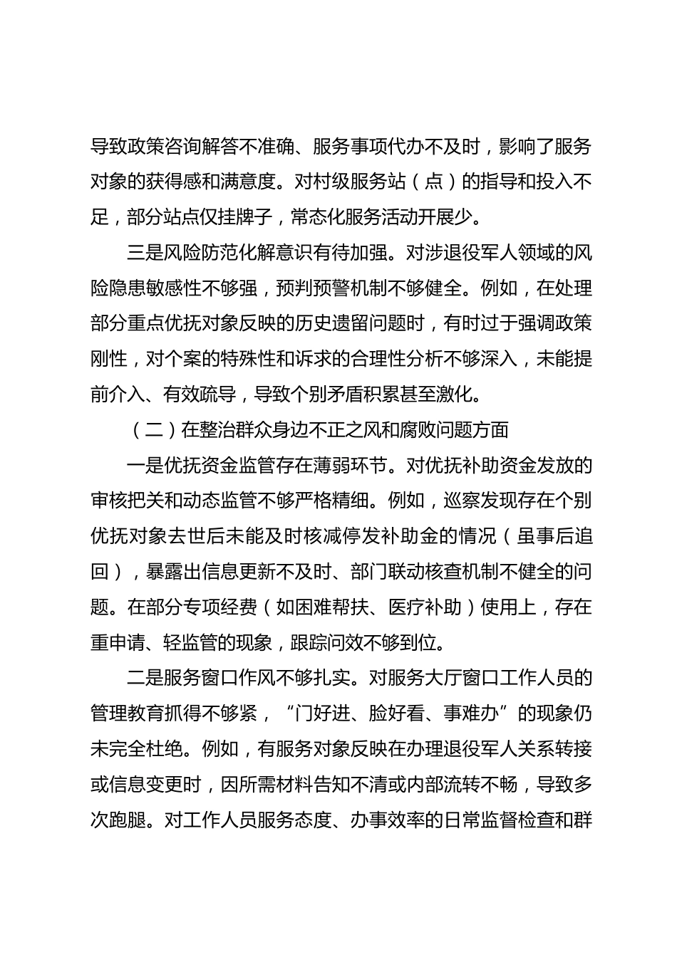 XX縣退役軍人事務局局長巡察整改專題民主生活會對照檢查材料根據(jù)縣委巡察工作部署要求和本次專題民主生活會安排,本人緊扣巡察反饋意見,結(jié)合自身思想、學習和工作實際,深入查擺突出問題,深刻剖析問題根源,明確整改方向和措施?,F(xiàn)將對照檢查情況匯報如下:一、查找出的突出問題(一)在貫徹落實黨中央重大決策部署和省委、市委、縣委工作要求方面一是政策落地“最后一公里”存在溫差。對上級關(guān)于退役軍人工作的決策部署有時理解不夠深透,結(jié)合實際創(chuàng)造性落實有差距。例如,在推動退役軍人“建檔立卡”信息動態(tài)更新工作中,滿足于完成基礎(chǔ)錄入,但對數(shù)據(jù)的精準分析和深...