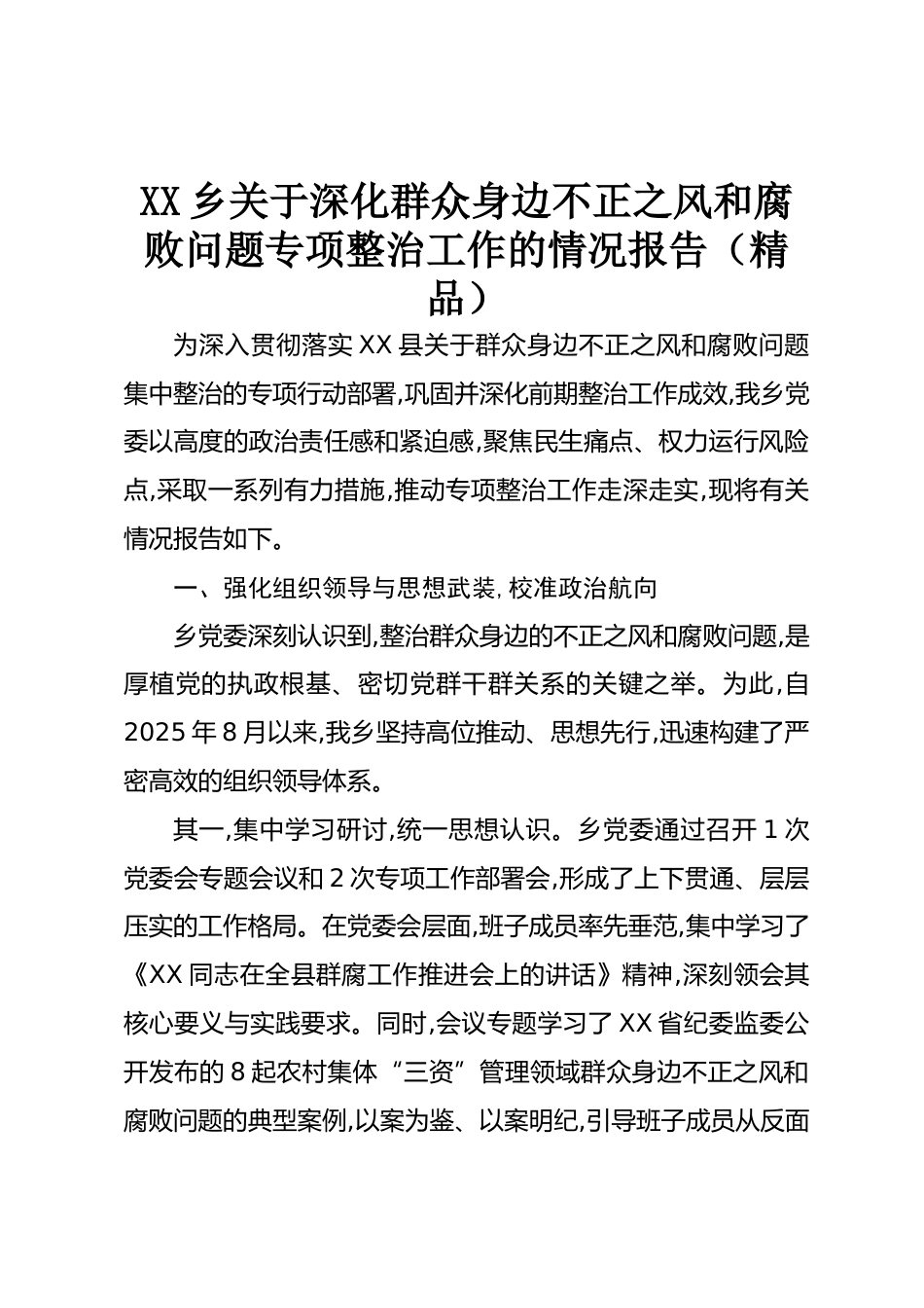 XX鄉(xiāng)關(guān)于深化群眾身邊不正之風(fēng)和腐敗問題專項整治工作的情況報告(精品)