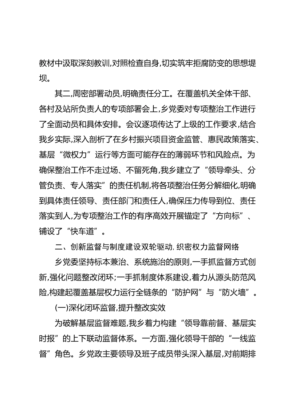 XX鄉(xiāng)關(guān)于深化群眾身邊不正之風(fēng)和腐敗問題專項整治工作的情況報告(精品)為深入貫徹落實XX縣關(guān)于群眾身邊不正之風(fēng)和腐敗問題集中整治的專項行動部署,鞏固并深化前期整治工作成效,我鄉(xiāng)黨委以高度的政治責(zé)任感和緊迫感,聚焦民生痛點、權(quán)力運行風(fēng)險點,采取一系列有力措施,推動專項整治工作走深走實,現(xiàn)將有關(guān)情況報告如下。一、強化組織領(lǐng)導(dǎo)與思想武裝,校準(zhǔn)政治航向鄉(xiāng)黨委深刻認(rèn)識到,整治群眾身邊的不正之風(fēng)和腐敗問題,是厚植黨的執(zhí)政根基、密切黨群干群關(guān)系的關(guān)鍵之舉。為此,自2025年8月以來,我鄉(xiāng)堅持高位推動、思想先行,迅速構(gòu)建了嚴(yán)密高效的組織領(lǐng)導(dǎo)體系。其一,集中學(xué)習(xí)研...