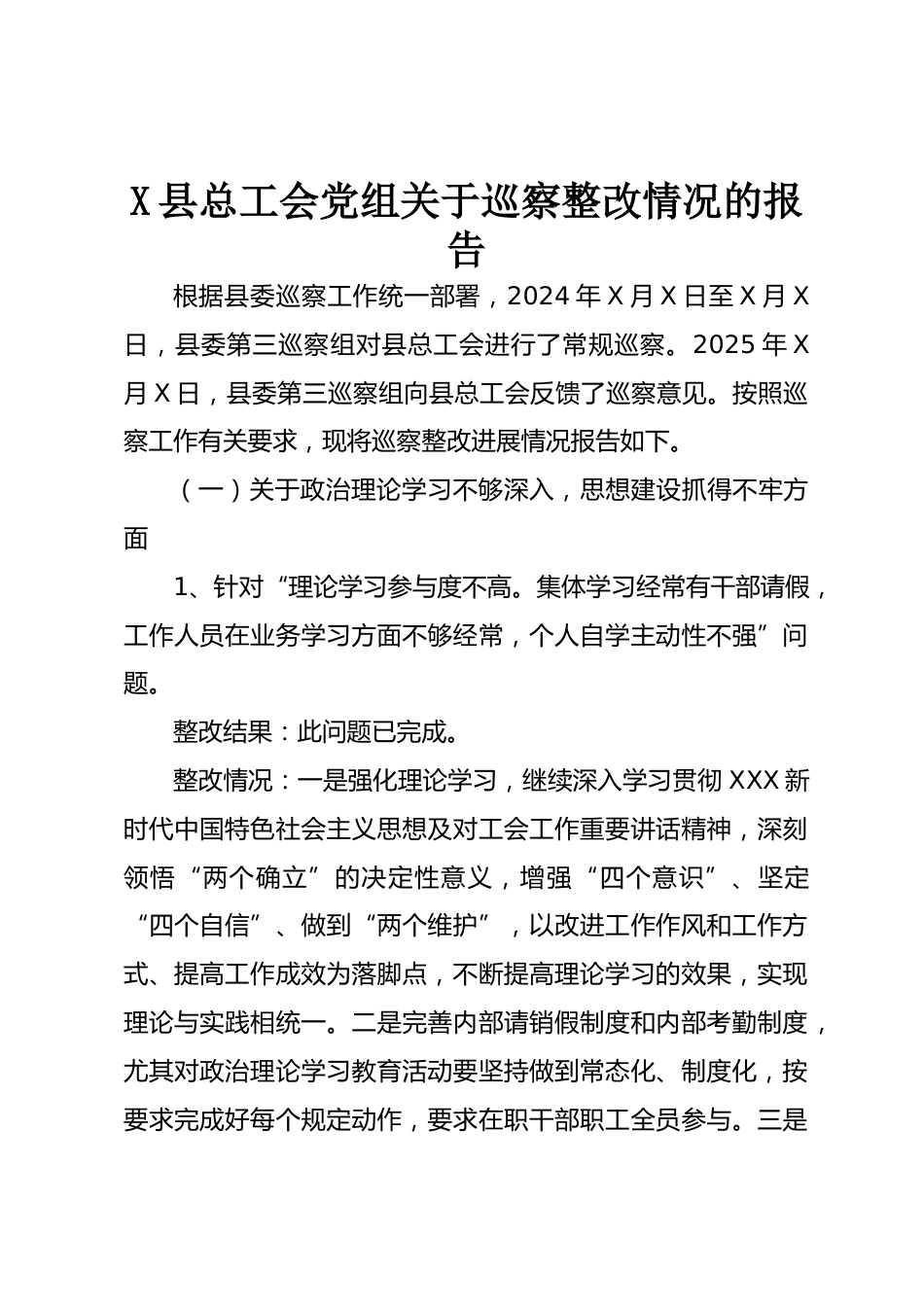 X縣總工會黨組關(guān)于巡察整改情況的報告根據(jù)縣委巡察工作統(tǒng)一部署,2024年X月X日至X月X日,縣委第三巡察組對縣總工會進行了常規(guī)巡察。2025年X月X日,縣委第三巡察組向縣總工會反饋了巡察意見。按照巡察工作有關(guān)要求,現(xiàn)將巡察整改進展情況報告如下。(一)關(guān)于政治理論學(xué)習(xí)不夠深入,思想建設(shè)抓得不牢方面1、針對“理論學(xué)習(xí)參與度不高。集體學(xué)習(xí)經(jīng)常有干部請假,工作人員在業(yè)務(wù)學(xué)習(xí)方面不夠經(jīng)常,個人自學(xué)主動性不強”問題。整改結(jié)果:此問題已完成。整改情況:一是強化理論學(xué)習(xí),繼續(xù)深入學(xué)習(xí)貫徹XXX新時代中國特色社會主義思想及對工會工作重要講話精神,深刻領(lǐng)悟“兩個...