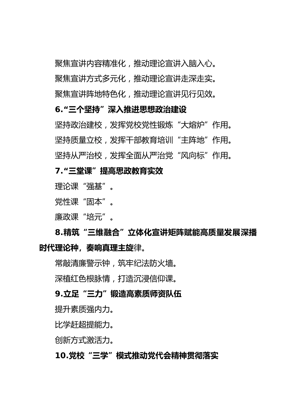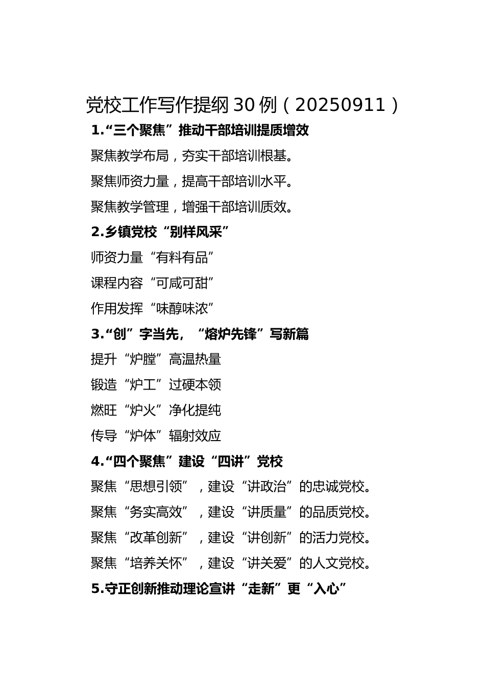 黨校工作寫作提綱30例(20250911)1.“三個聚焦”推動干部培訓提質(zhì)增效聚焦教學布局,夯實干部培訓根基。聚焦師資力量,提高干部培訓水平。聚焦教學管理,增強干部培訓質(zhì)效。2.鄉(xiāng)鎮(zhèn)黨?!皠e樣風采”師資力量“有料有品”課程內(nèi)容“可咸可甜”作用發(fā)揮“味醇味濃”3.“創(chuàng)”字當先,“熔爐先鋒”寫新篇提升“爐膛”高溫熱量鍛造“爐工”過硬本領燃旺“爐火”凈化提純傳導“爐體”輻射效應4.“四個聚焦”建設“四講”黨校聚焦“思想引領”,建設“講政治”的忠誠黨校。聚焦“務實高效”,建設“講質(zhì)量”的品質(zhì)黨校。聚焦“改革創(chuàng)新”,建設“講創(chuàng)新”的活力黨校。聚焦“培養(yǎng)...