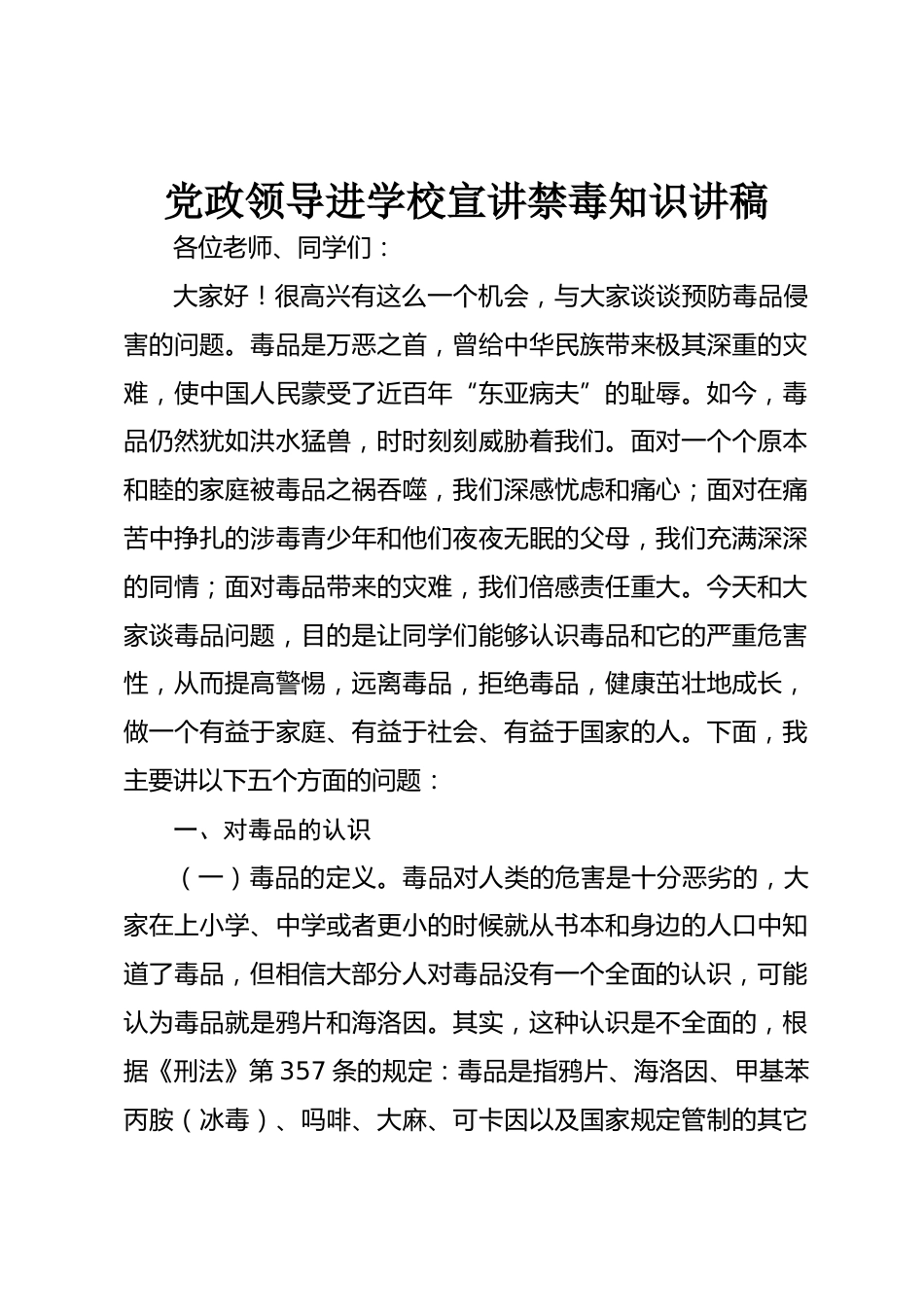 黨政領(lǐng)導(dǎo)進(jìn)學(xué)校宣講禁毒知識(shí)講稿VIP免費(fèi)