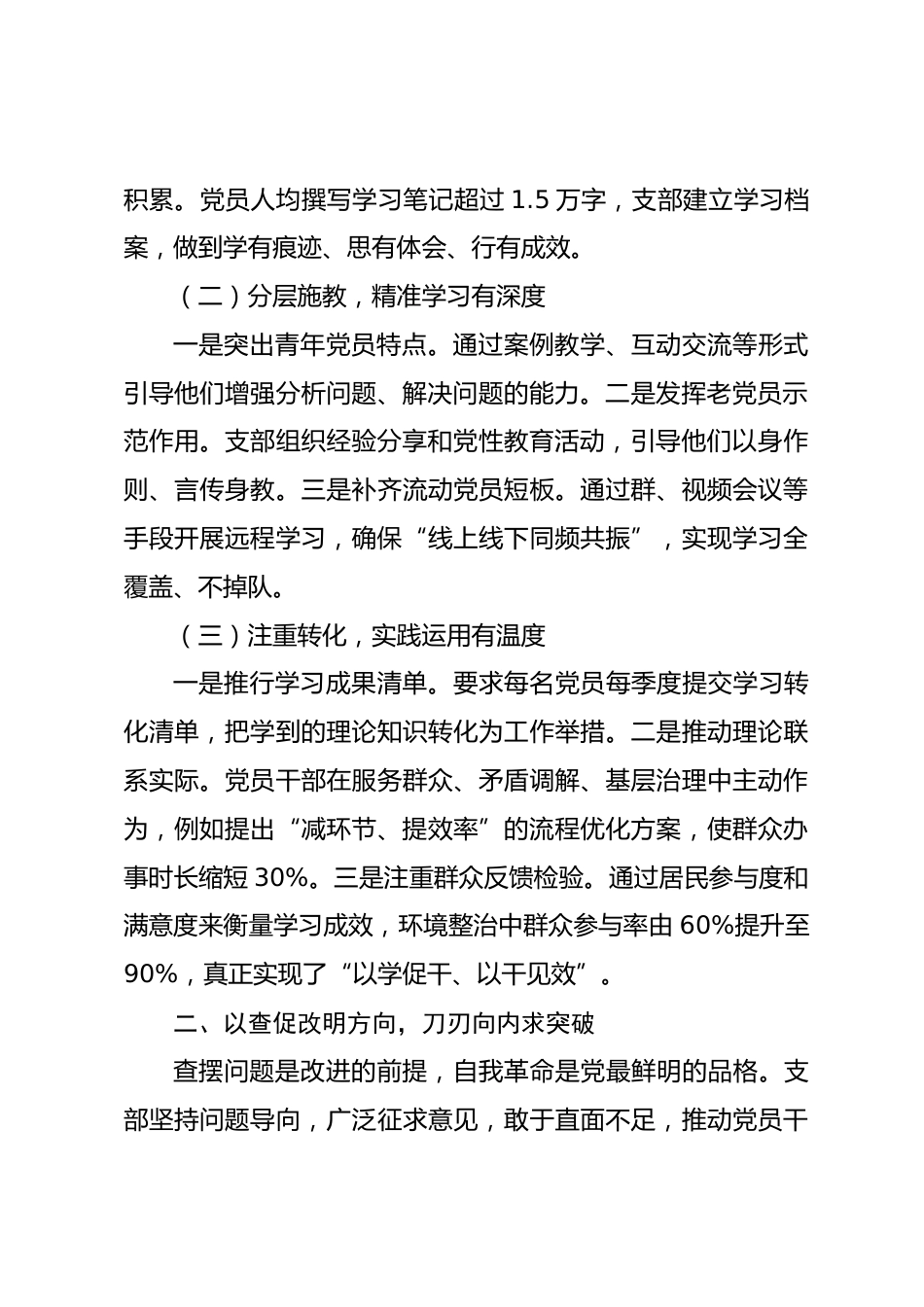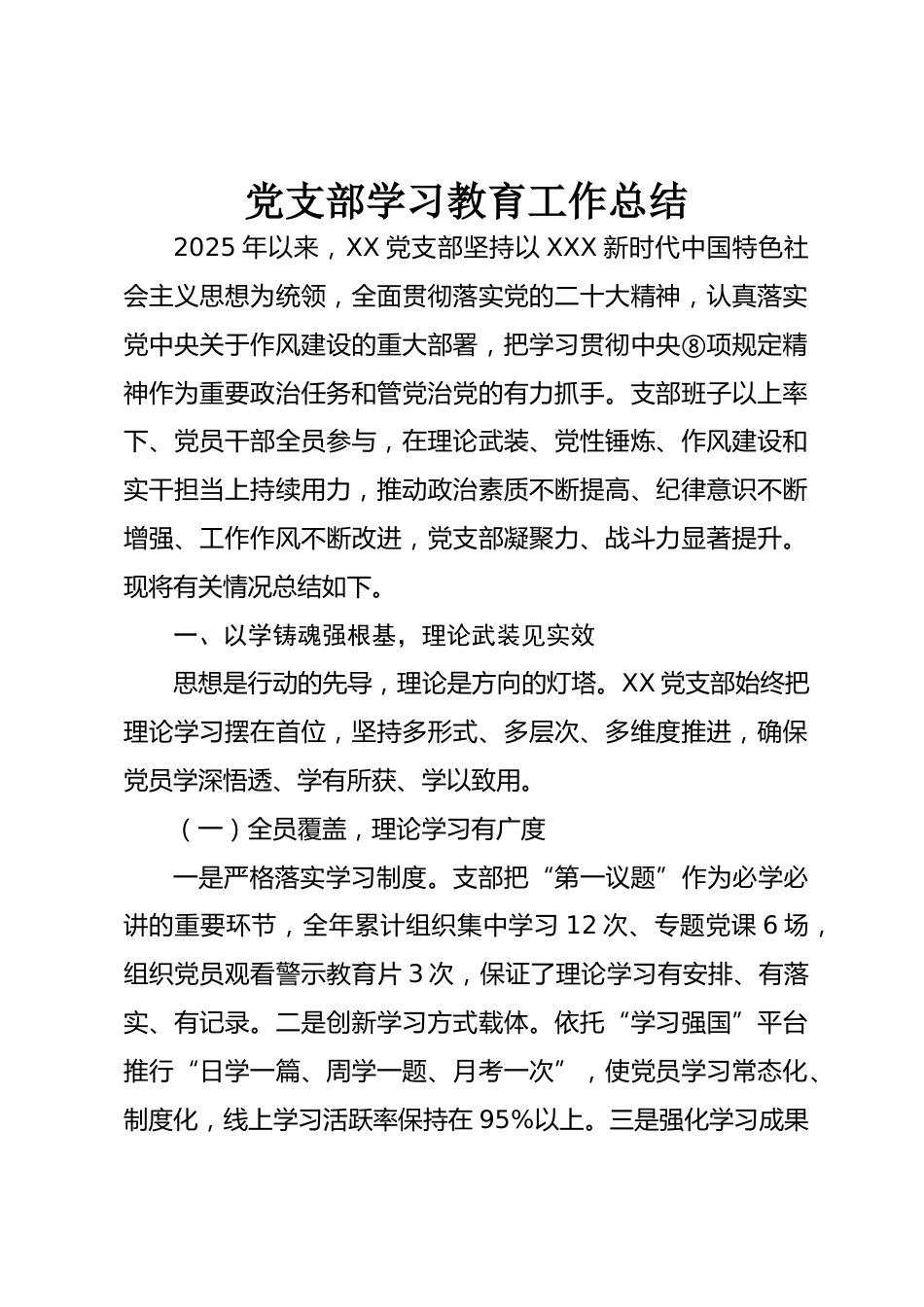 黨支部學(xué)習(xí)教育工作總結(jié)2025年以來,XX黨支部堅(jiān)持以XXX新時代中國特色社會主義思想為統(tǒng)領(lǐng),全面貫徹落實(shí)黨的二十大精神,認(rèn)真落實(shí)黨中央關(guān)于作風(fēng)建設(shè)的重大部署,把學(xué)習(xí)貫徹中央⑧項(xiàng)規(guī)定精神作為重要政治任務(wù)和管黨治黨的有力抓手。支部班子以上率下、黨員干部全員參與,在理論武裝、黨性錘煉、作風(fēng)建設(shè)和實(shí)干擔(dān)當(dāng)上持續(xù)用力,推動政治素質(zhì)不斷提高、紀(jì)律意識不斷增強(qiáng)、工作作風(fēng)不斷改進(jìn),黨支部凝聚力、戰(zhàn)斗力顯著提升。現(xiàn)將有關(guān)情況總結(jié)如下。一、以學(xué)鑄魂強(qiáng)根基,理論武裝見實(shí)效思想是行動的先導(dǎo),理論是方向的燈塔。XX黨支部始終把理論學(xué)習(xí)擺在首位,堅(jiān)持多形式、多...