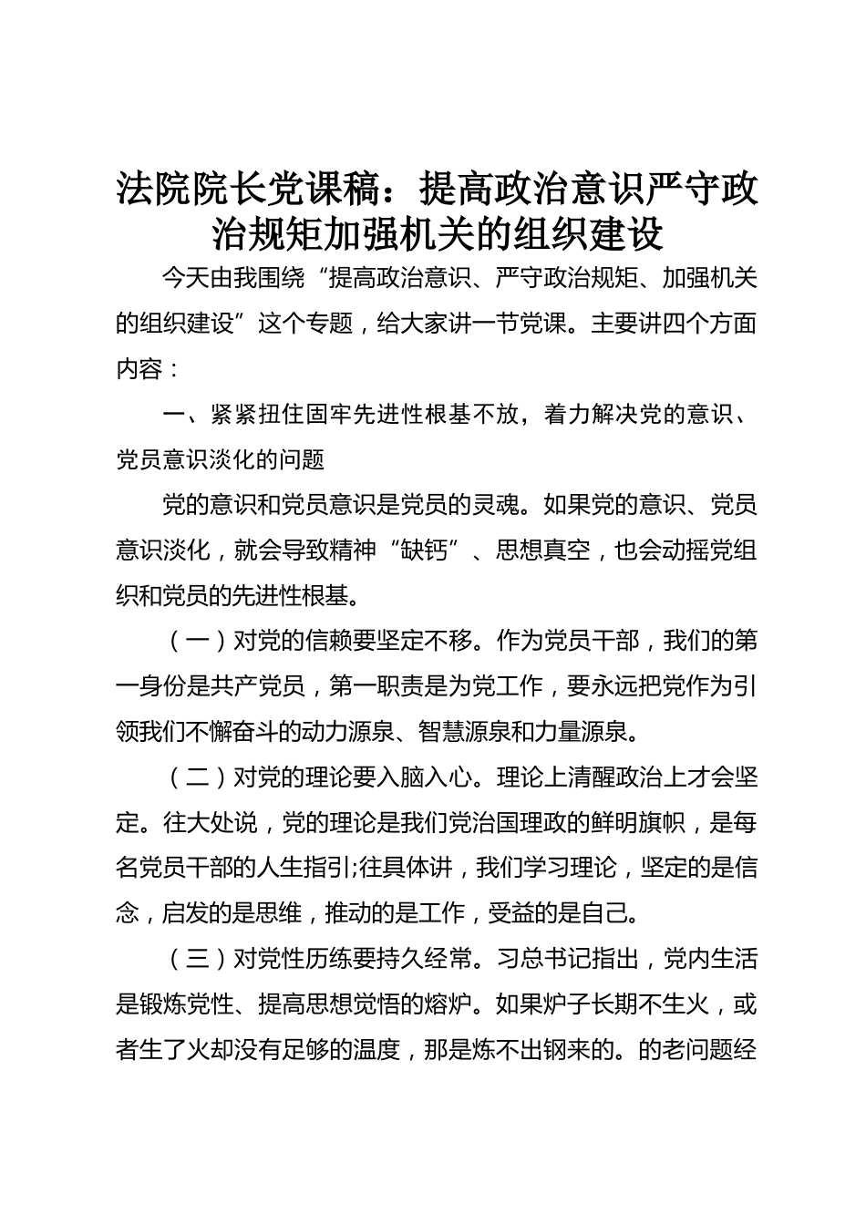 法院院長黨課稿:提高政治意識嚴(yán)守政治規(guī)矩加強(qiáng)機(jī)關(guān)的組織建設(shè)今天由我圍繞“提高政治意識、嚴(yán)守政治規(guī)矩、加強(qiáng)機(jī)關(guān)的組織建設(shè)”這個專題,給大家講一節(jié)黨課。主要講四個方面內(nèi)容:一、緊緊扭住固牢先進(jìn)性根基不放,著力解決黨的意識、黨員意識淡化的問題黨的意識和黨員意識是黨員的靈魂。如果黨的意識、黨員意識淡化,就會導(dǎo)致精神“缺鈣”、思想真空,也會動搖黨組織和黨員的先進(jìn)性根基。(一)對黨的信賴要堅定不移。作為黨員干部,我們的第一身份是共產(chǎn)黨員,第一職責(zé)是為黨工作,要永遠(yuǎn)把黨作為引領(lǐng)我們不懈奮斗的動力源泉、智慧源泉和力量源泉。(二)對黨的理論要...
