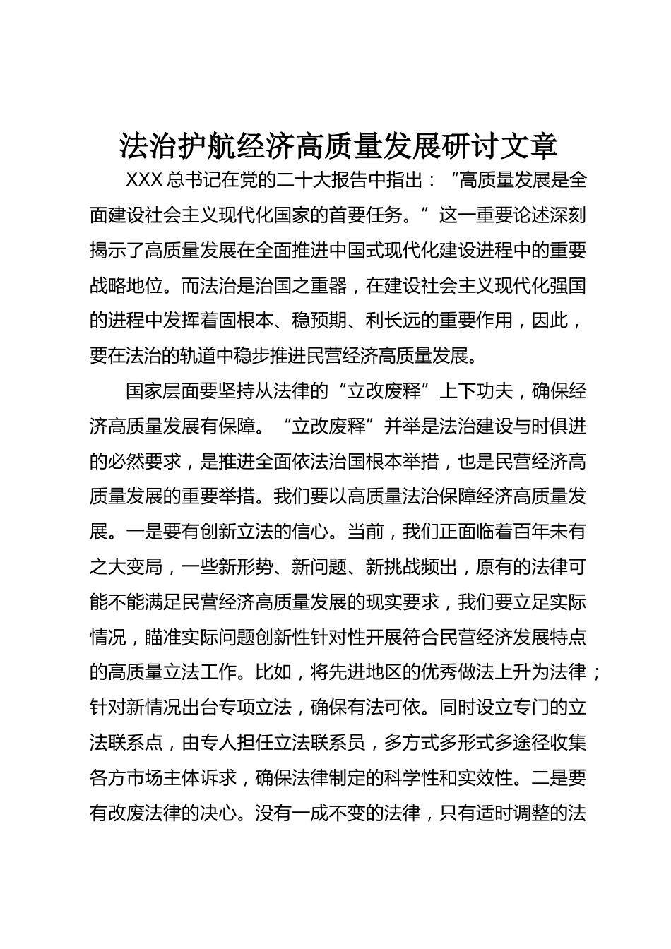 法治護航經(jīng)濟高質(zhì)量發(fā)展研討文章XXX總書記在黨的二十大報告中指出:“高質(zhì)量發(fā)展是全面建設(shè)社會主義現(xiàn)代化國家的首要任務(wù)?!边@一重要論述深刻揭示了高質(zhì)量發(fā)展在全面推進中國式現(xiàn)代化建設(shè)進程中的重要戰(zhàn)略地位。而法治是治國之重器,在建設(shè)社會主義現(xiàn)代化強國的進程中發(fā)揮著固根本、穩(wěn)預期、利長遠的重要作用,因此,要在法治的軌道中穩(wěn)步推進民營經(jīng)濟高質(zhì)量發(fā)展。國家層面要堅持從法律的“立改廢釋”上下功夫,確保經(jīng)濟高質(zhì)量發(fā)展有保障?!傲⒏膹U釋”并舉是法治建設(shè)與時俱進的必然要求,是推進全面依法治國根本舉措,也是民營經(jīng)濟高質(zhì)量發(fā)展的重要舉措。我們要以高質(zhì)...