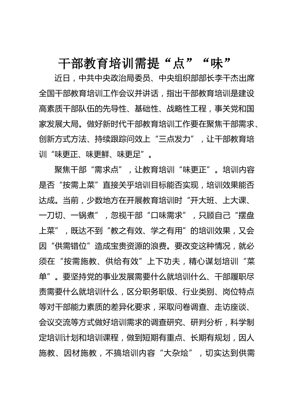 干部教育培訓需提“點”“味”近日,中共中央政治局委員、中央組織部部長李干杰出席全國干部教育培訓工作會議并講話,指出干部教育培訓是建設高素質干部隊伍的先導性、基礎性、戰(zhàn)略性工程,事關黨和國家發(fā)展大局。做好新時代干部教育培訓工作要在聚焦干部需求、創(chuàng)新方式方法、持續(xù)跟蹤問效上“三點發(fā)力”,讓干部教育培訓“味更正、味更鮮、味更足”。聚焦干部“需求點”,讓教育培訓“味更正”。培訓內(nèi)容是否“按需上菜”直接關乎培訓目標能否實現(xiàn),培訓效果能否達成。當前,少數(shù)地方在開展教育培訓時“開大班、上大課、一刀切、一鍋煮”,忽視干部“口味需求”,只顧自...