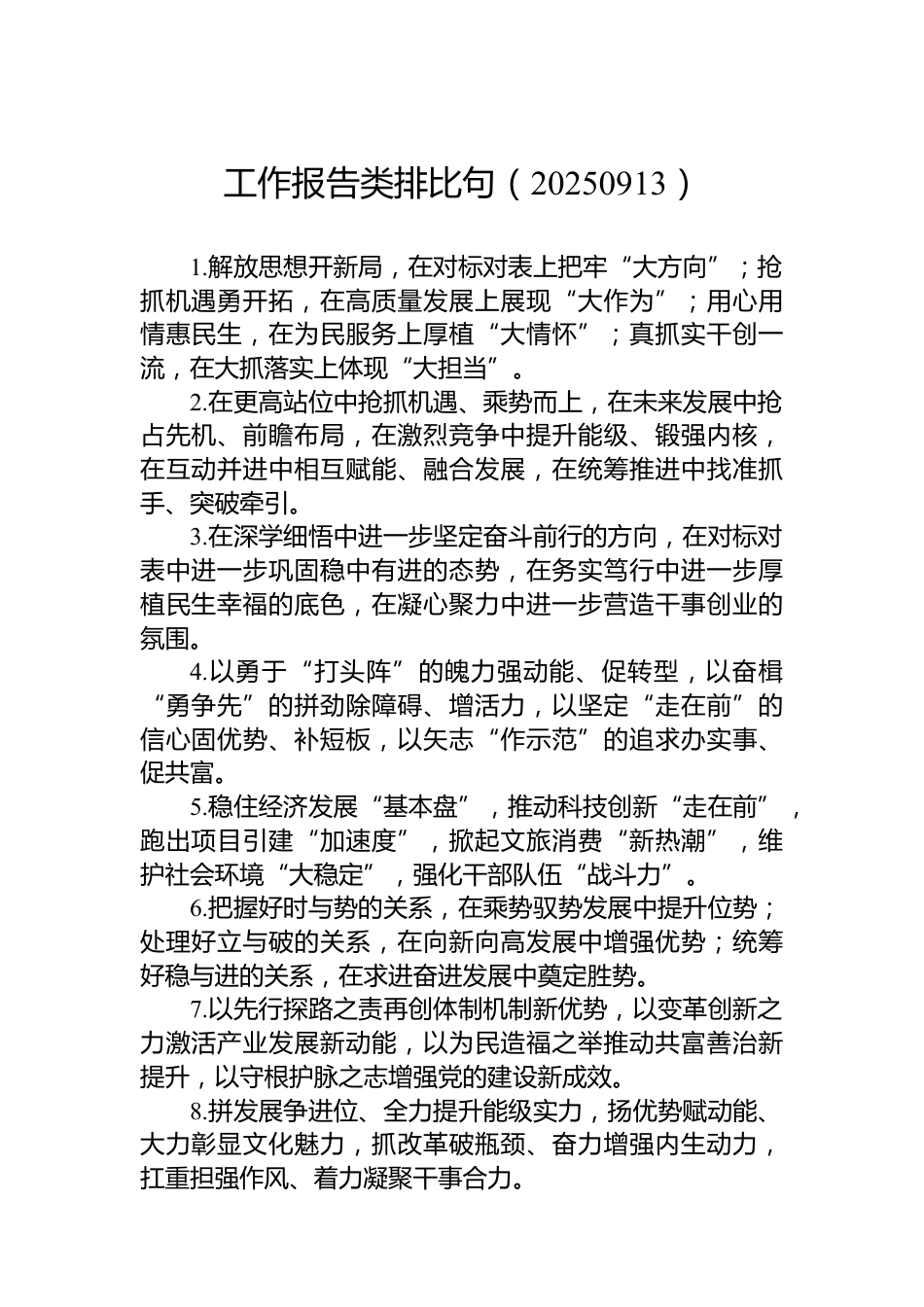 工作報(bào)告類排比句(20250913)1.解放思想開新局,在對(duì)標(biāo)對(duì)表上把牢“大方向”;搶抓機(jī)遇勇開拓,在高質(zhì)量發(fā)展上展現(xiàn)“大作為”;用心用情惠民生,在為民服務(wù)上厚植“大情懷”;真抓實(shí)干創(chuàng)一流,在大抓落實(shí)上體現(xiàn)“大擔(dān)當(dāng)”。2.在更高站位中搶抓機(jī)遇、乘勢(shì)而上,在未來發(fā)展中搶占先機(jī)、前瞻布局,在激烈競(jìng)爭(zhēng)中提升能級(jí)、鍛強(qiáng)內(nèi)核,在互動(dòng)并進(jìn)中相互賦能、融合發(fā)展,在統(tǒng)籌推進(jìn)中找準(zhǔn)抓手、突破牽引。3.在深學(xué)細(xì)悟中進(jìn)一步堅(jiān)定奮斗前行的方向,在對(duì)標(biāo)對(duì)表中進(jìn)一步鞏固穩(wěn)中有進(jìn)的態(tài)勢(shì),在務(wù)實(shí)篤行中進(jìn)一步厚植民生幸福的底色,在凝心聚力中進(jìn)一步營造干事創(chuàng)業(yè)的氛圍。4.以勇...