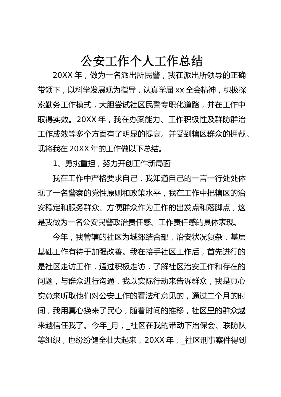 公安工作個(gè)人工作總結(jié)20XX年,做為一名派出所民警,我在派出所領(lǐng)導(dǎo)的正確帶領(lǐng)下,以科學(xué)發(fā)展觀為指導(dǎo),認(rèn)真學(xué)屆xx全會精神,積極探索勤務(wù)工作模式,大膽嘗試社區(qū)民警專職化道路,并在工作中取得實(shí)效。20XX年,我在辦案能力、工作積極性及群防群治工作成效等多個(gè)方面有了明顯的提高。并受到轄區(qū)群眾的擁戴?,F(xiàn)將我在20XX年的工作做以下總結(jié)。1、勇挑重?fù)?dān),努力開創(chuàng)工作新局面我在工作中嚴(yán)格要求自己,我知道自己的一言一行處處體現(xiàn)了一名警察的黨性原則和政策水平,我在工作中把轄區(qū)的治安穩(wěn)定和服務(wù)群眾、方便群眾作為工作的出發(fā)點(diǎn)和落腳點(diǎn),這是我做為一名公安民警政治...