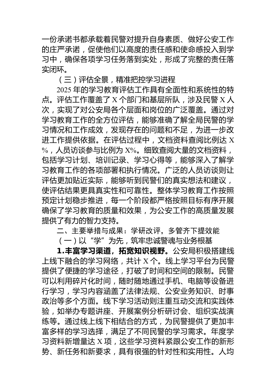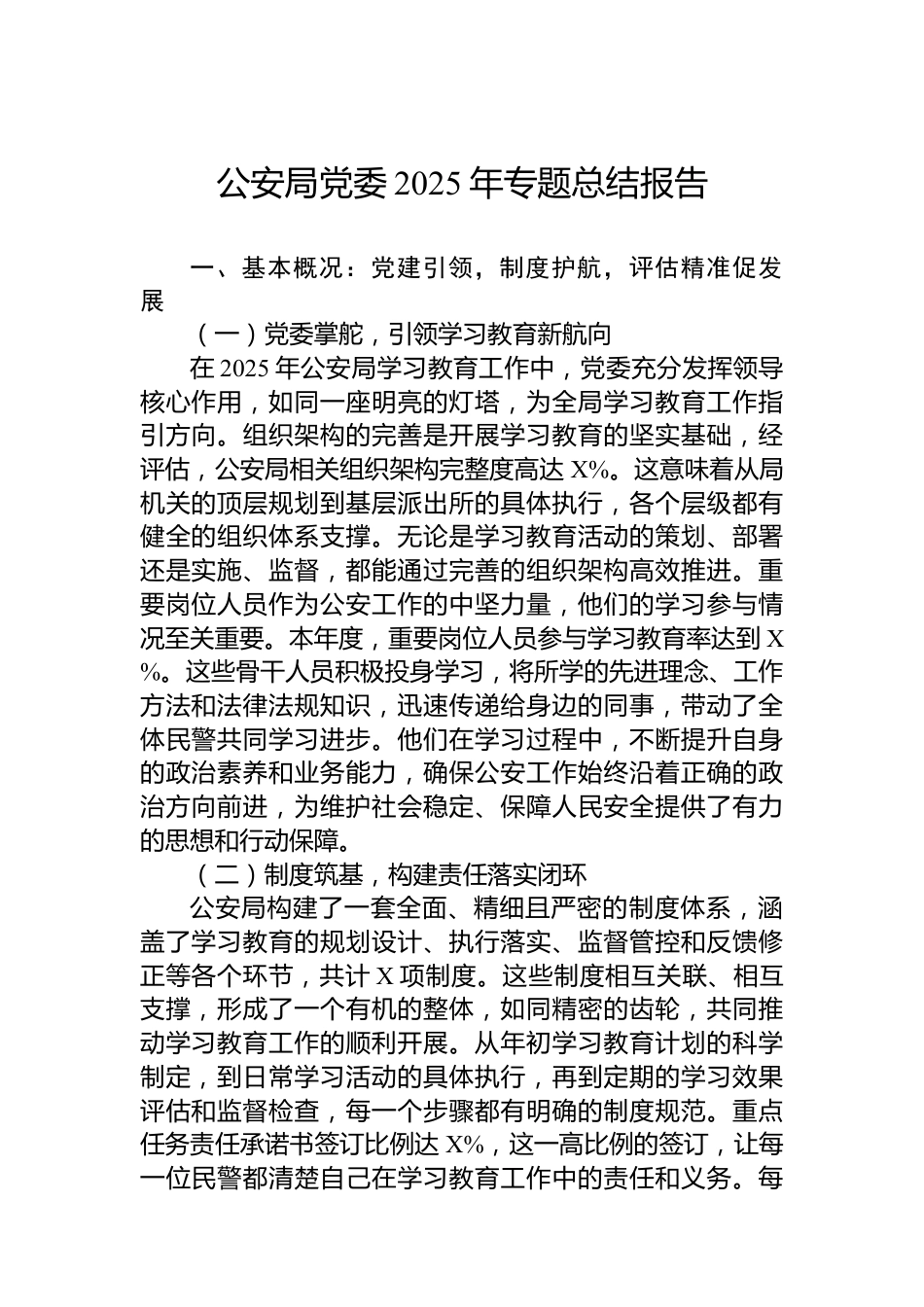 公安局黨委2025年專題總結(jié)報(bào)告一、基本概況:黨建引領(lǐng),制度護(hù)航,評估精準(zhǔn)促發(fā)展(一)黨委掌舵,引領(lǐng)學(xué)習(xí)教育新航向在2025年公安局學(xué)習(xí)教育工作中,黨委充分發(fā)揮領(lǐng)導(dǎo)核心作用,如同一座明亮的燈塔,為全局學(xué)習(xí)教育工作指引方向。組織架構(gòu)的完善是開展學(xué)習(xí)教育的堅(jiān)實(shí)基礎(chǔ),經(jīng)評估,公安局相關(guān)組織架構(gòu)完整度高達(dá)X%。這意味著從局機(jī)關(guān)的頂層規(guī)劃到基層派出所的具體執(zhí)行,各個層級都有健全的組織體系支撐。無論是學(xué)習(xí)教育活動的策劃、部署還是實(shí)施、監(jiān)督,都能通過完善的組織架構(gòu)高效推進(jìn)。重要崗位人員作為公安工作的中堅(jiān)力量,他們的學(xué)習(xí)參與情況至關(guān)重要。本年度,重要...