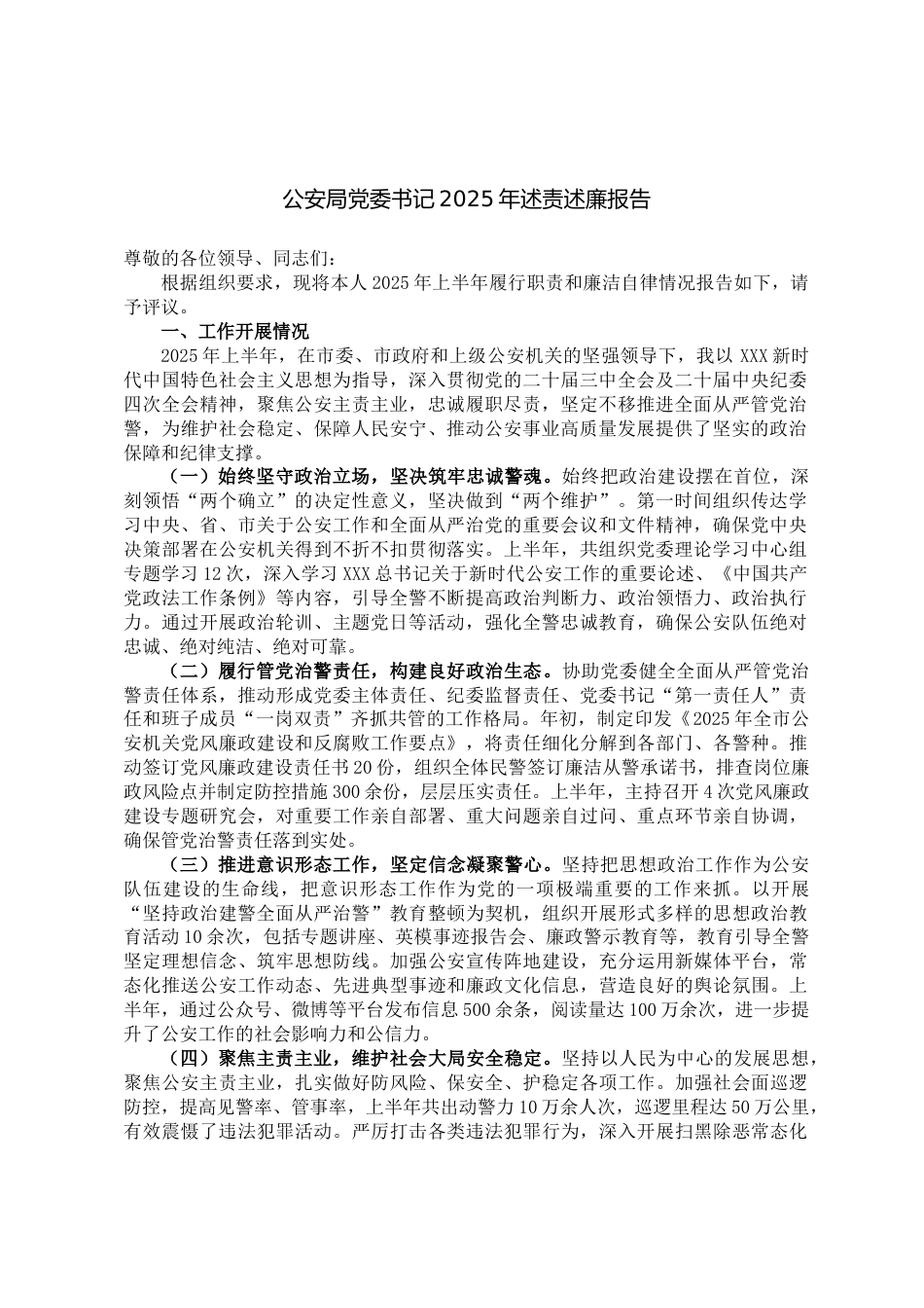 公安局黨委書記2025年述責(zé)述廉報(bào)告尊敬的各位領(lǐng)導(dǎo)、同志們:根據(jù)組織要求,現(xiàn)將本人2025年上半年履行職責(zé)和廉潔自律情況報(bào)告如下,請(qǐng)予評(píng)議。一、工作開展情況2025年上半年,在市委、市政府和上級(jí)公安機(jī)關(guān)的堅(jiān)強(qiáng)領(lǐng)導(dǎo)下,我以XXX新時(shí)代中國特色社會(huì)主義思想為指導(dǎo),深入貫徹黨的二十屆三中全會(huì)及二十屆中央紀(jì)委四次全會(huì)精神,聚焦公安主責(zé)主業(yè),忠誠履職盡責(zé),堅(jiān)定不移推進(jìn)全面從嚴(yán)管黨治警,為維護(hù)社會(huì)穩(wěn)定、保障人民安寧、推動(dòng)公安事業(yè)高質(zhì)量發(fā)展提供了堅(jiān)實(shí)的政治保障和紀(jì)律支撐。(一)始終堅(jiān)守政治立場(chǎng),堅(jiān)決筑牢忠誠警魂。始終把政治建設(shè)擺在首位,深刻領(lǐng)悟“兩個(gè)確...