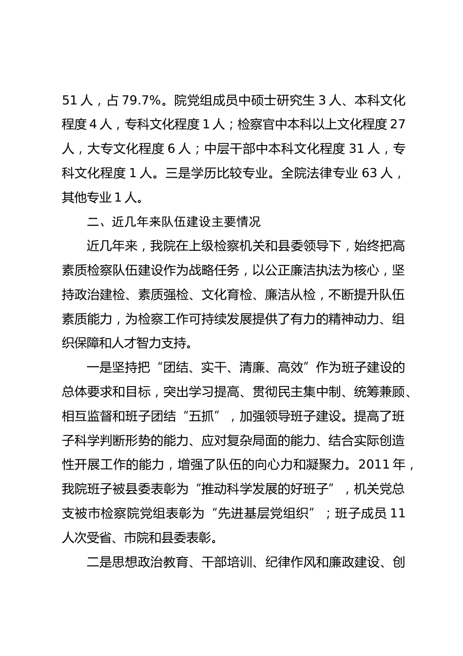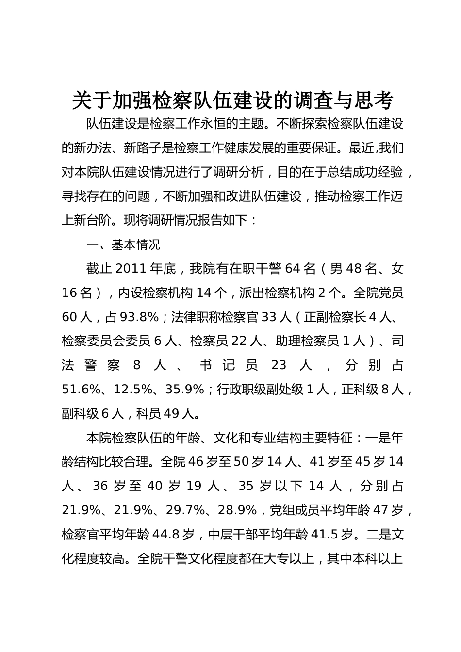 關(guān)于加強檢察隊伍建設(shè)的調(diào)查與思考隊伍建設(shè)是檢察工作永恒的主題。不斷探索檢察隊伍建設(shè)的新辦法、新路子是檢察工作健康發(fā)展的重要保證。最近,我們對本院隊伍建設(shè)情況進行了調(diào)研分析,目的在于總結(jié)成功經(jīng)驗,尋找存在的問題,不斷加強和改進隊伍建設(shè),推動檢察工作邁上新臺階?,F(xiàn)將調(diào)研情況報告如下:一、基本情況截止2011年底,我院有在職干警64名(男48名、女16名),內(nèi)設(shè)檢察機構(gòu)14個,派出檢察機構(gòu)2個。全院黨員60人,占93.8%;法律職稱檢察官33人(正副檢察長4人、檢察委員會委員6人、檢察員22人、助理檢察員1人)、司法警察8人、書記員23人,分別占51.6%、12.5%、3...