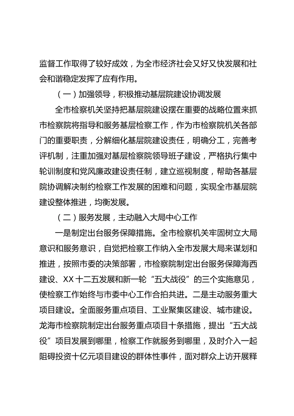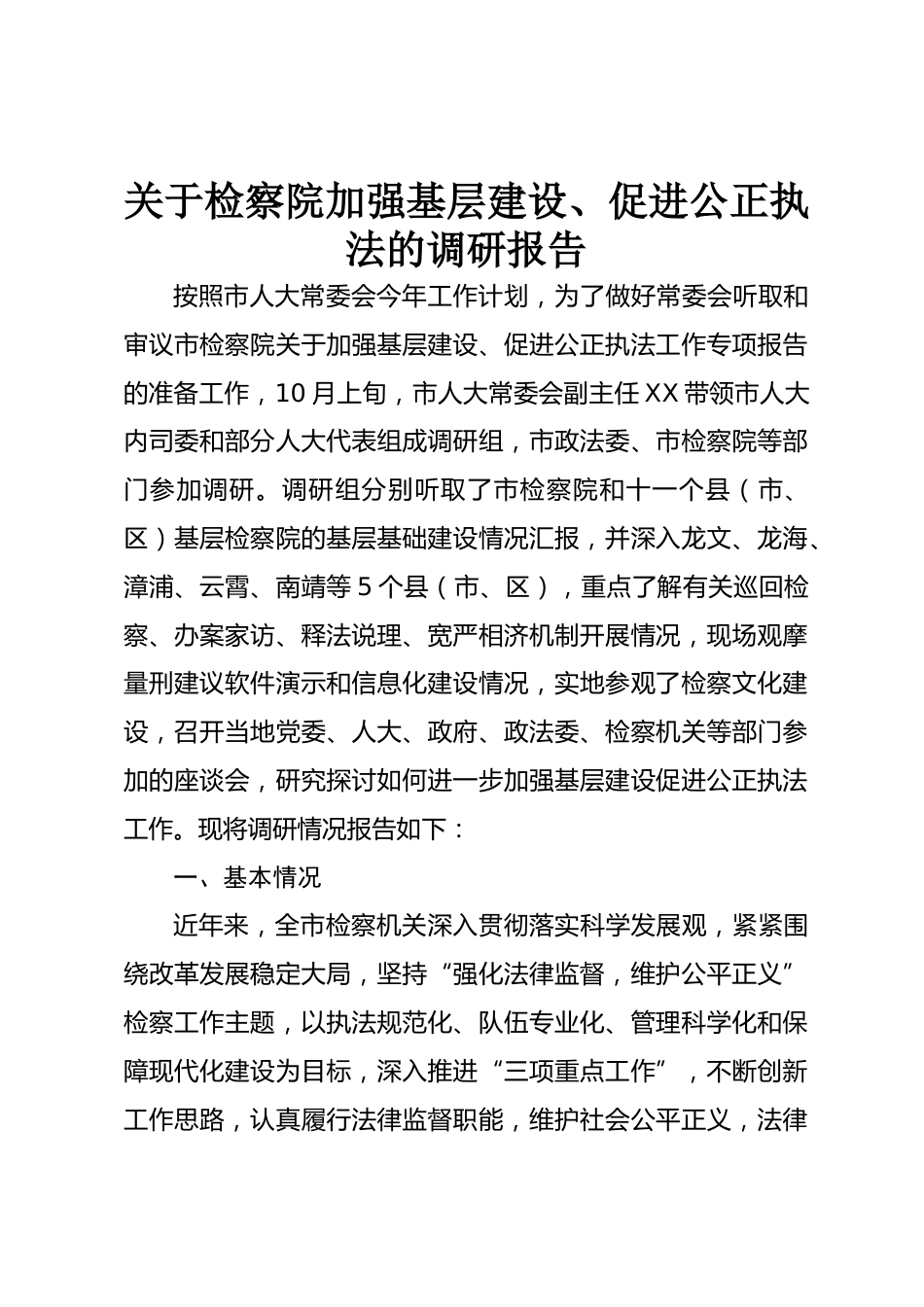 關(guān)于檢察院加強基層建設(shè)、促進公正執(zhí)法的調(diào)研報告按照市人大常委會今年工作計劃,為了做好常委會聽取和審議市檢察院關(guān)于加強基層建設(shè)、促進公正執(zhí)法工作專項報告的準備工作,10月上旬,市人大常委會副主任XX帶領(lǐng)市人大內(nèi)司委和部分人大代表組成調(diào)研組,市政法委、市檢察院等部門參加調(diào)研。調(diào)研組分別聽取了市檢察院和十一個縣(市、區(qū))基層檢察院的基層基礎(chǔ)建設(shè)情況匯報,并深入龍文、龍海、漳浦、云霄、南靖等5個縣(市、區(qū)),重點了解有關(guān)巡回檢察、辦案家訪、釋法說理、寬嚴相濟機制開展情況,現(xiàn)場觀摩量刑建議軟件演示和信息化建設(shè)情況,實地參觀了檢察文化建設(shè),...