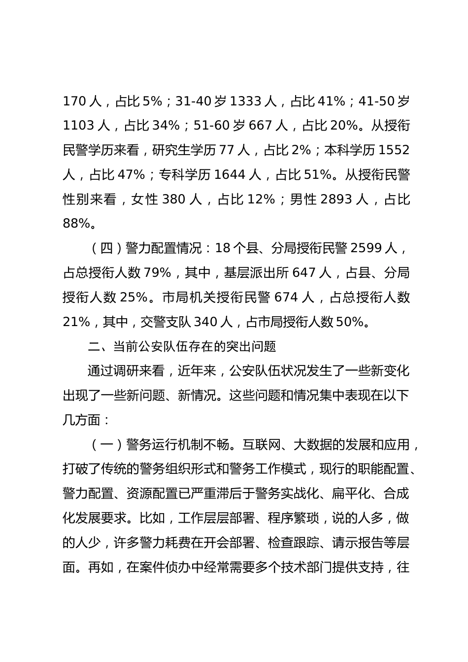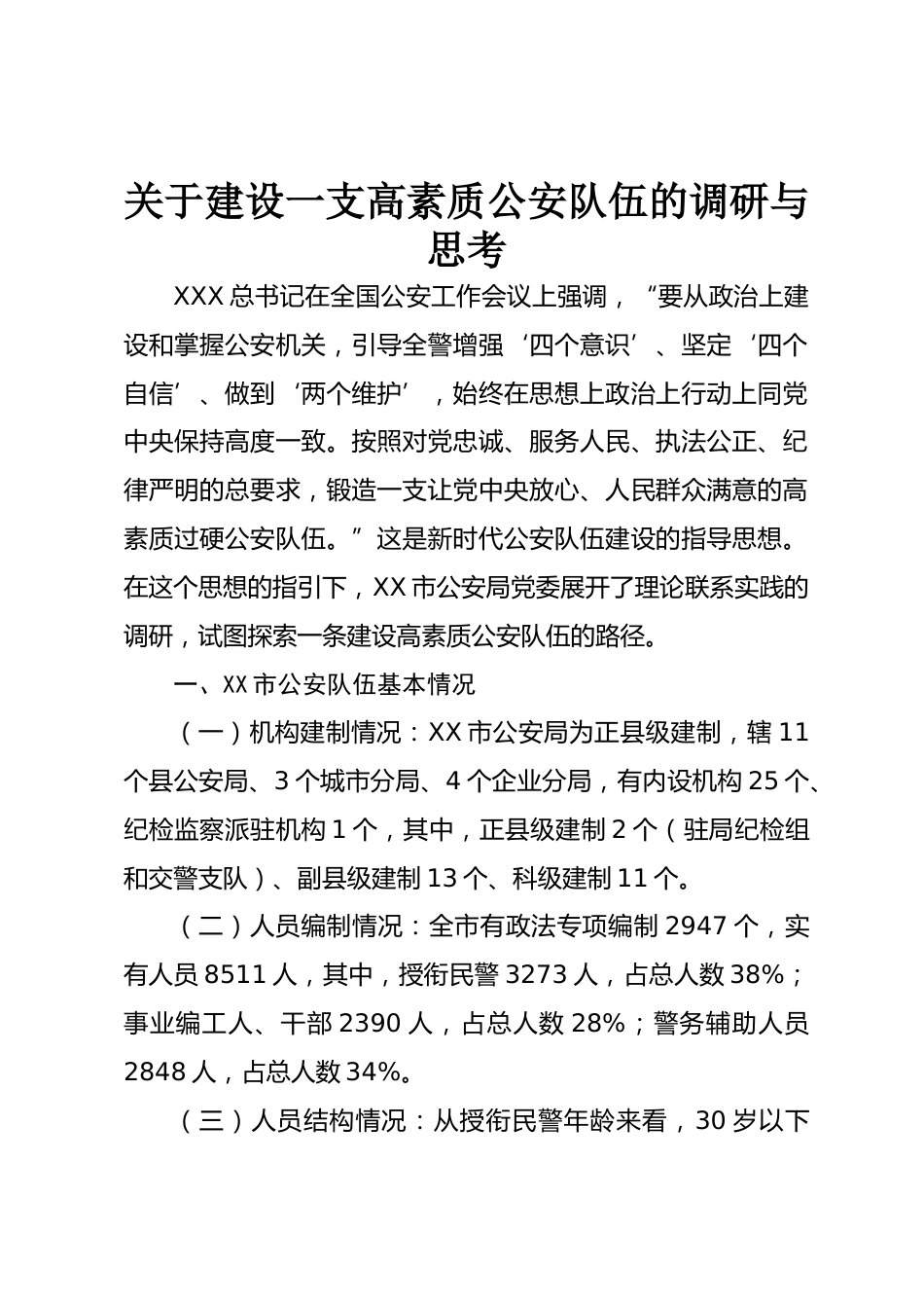 關(guān)于建設(shè)一支高素質(zhì)公安隊伍的調(diào)研與思考XXX總書記在全國公安工作會議上強(qiáng)調(diào),“要從政治上建設(shè)和掌握公安機(jī)關(guān),引導(dǎo)全警增強(qiáng)‘四個意識’、堅定‘四個自信’、做到‘兩個維護(hù)’,始終在思想上政治上行動上同黨中央保持高度一致。按照對黨忠誠、服務(wù)人民、執(zhí)法公正、紀(jì)律嚴(yán)明的總要求,鍛造一支讓黨中央放心、人民群眾滿意的高素質(zhì)過硬公安隊伍?!边@是新時代公安隊伍建設(shè)的指導(dǎo)思想。在這個思想的指引下,XX市公安局黨委展開了理論聯(lián)系實踐的調(diào)研,試圖探索一條建設(shè)高素質(zhì)公安隊伍的路徑。一、XX市公安隊伍基本情況(一)機(jī)構(gòu)建制情況:XX市公安局為正縣級建制,轄11個...
