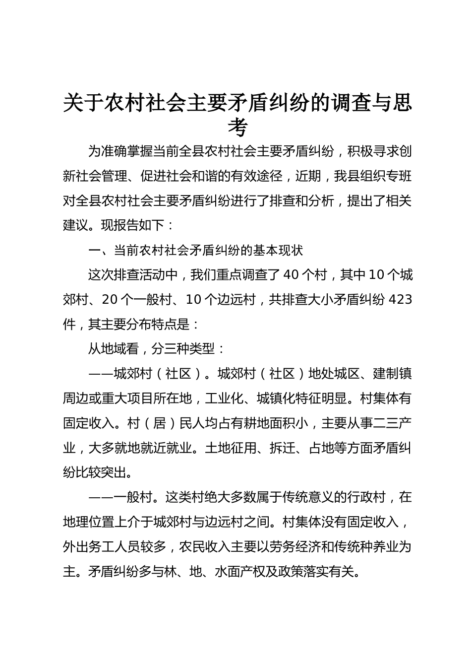 關(guān)于農(nóng)村社會主要矛盾糾紛的調(diào)查與思考為準確掌握當前全縣農(nóng)村社會主要矛盾糾紛,積極尋求創(chuàng)新社會管理、促進社會和諧的有效途徑,近期,我縣組織專班對全縣農(nóng)村社會主要矛盾糾紛進行了排查和分析,提出了相關(guān)建議。現(xiàn)報告如下:一、當前農(nóng)村社會矛盾糾紛的基本現(xiàn)狀這次排查活動中,我們重點調(diào)查了40個村,其中10個城郊村、20個一般村、10個邊遠村,共排查大小矛盾糾紛423件,其主要分布特點是:從地域看,分三種類型:——城郊村(社區(qū))。城郊村(社區(qū))地處城區(qū)、建制鎮(zhèn)周邊或重大項目所在地,工業(yè)化、城鎮(zhèn)化特征明顯。村集體有固定收入。村(居)民人均占有耕地面積...