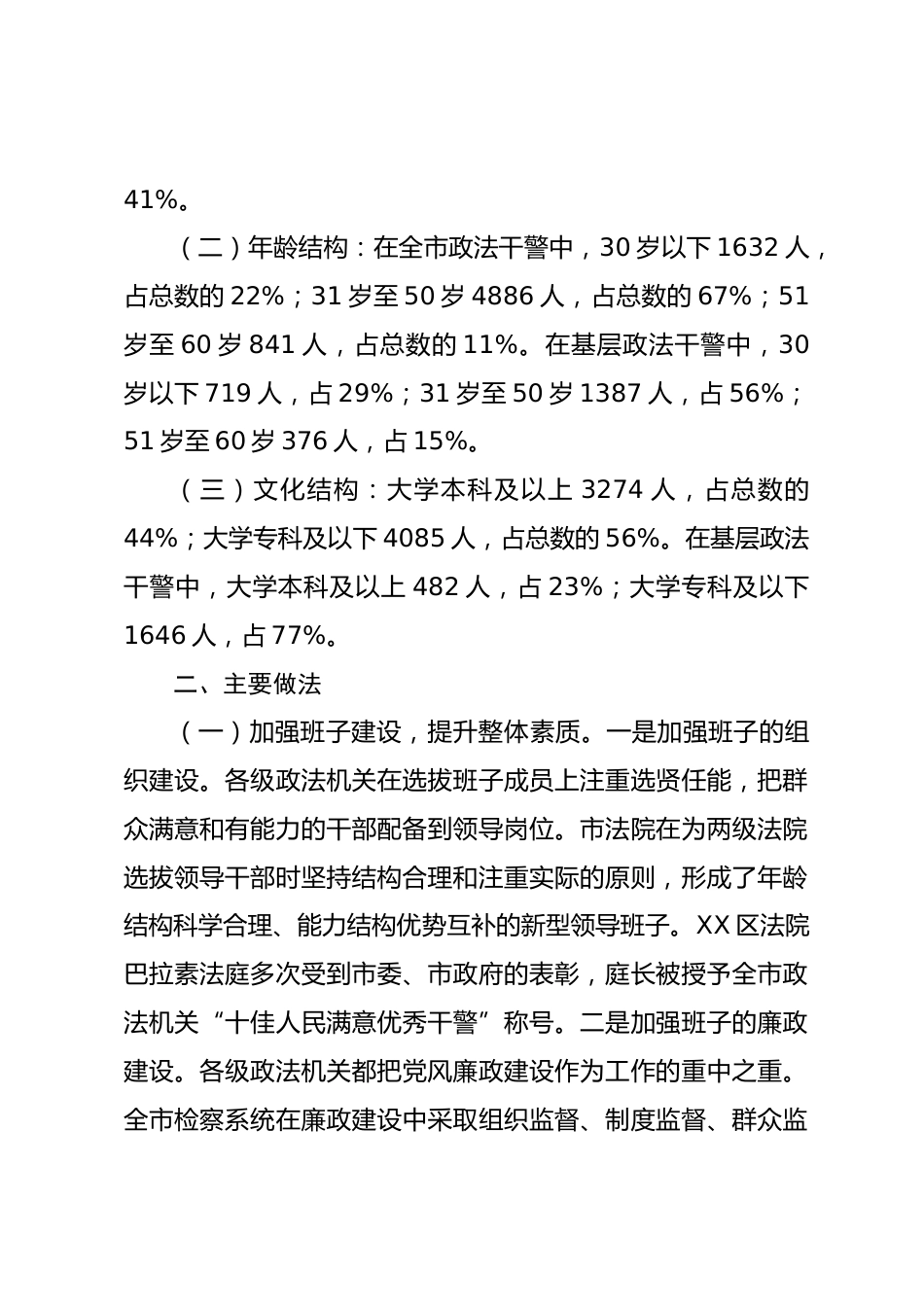 關(guān)于我市基層政法隊(duì)伍建設(shè)情況的調(diào)研報(bào)告根據(jù)市政協(xié)年初工作安排,10月下旬,法制委在XX副主席帶領(lǐng)下,組織部分委員并會(huì)同市法院、檢察院、公安局、司法局等相關(guān)部門,先后赴XX、XX、X縣、XX等縣區(qū),深入派出所、司法所和鄉(xiāng)鎮(zhèn)法庭,通過(guò)實(shí)地察看、個(gè)別走訪、聽(tīng)取匯報(bào)和座談?dòng)懻摰确绞?,?duì)基層政法隊(duì)伍建設(shè)情況進(jìn)行了專題調(diào)研?,F(xiàn)將調(diào)研情況報(bào)告如下:一、基本情況近年來(lái),我市各級(jí)政法機(jī)關(guān)不斷加強(qiáng)政法隊(duì)伍建設(shè),著力提高基層政法干警素質(zhì),無(wú)論是人員結(jié)構(gòu)、年齡結(jié)構(gòu)和文化結(jié)構(gòu)等諸多因素都發(fā)生的深刻的變化。為保民生、保穩(wěn)定、推動(dòng)社會(huì)經(jīng)濟(jì)各項(xiàng)事業(yè)順利進(jìn)行,發(fā)揮了積...