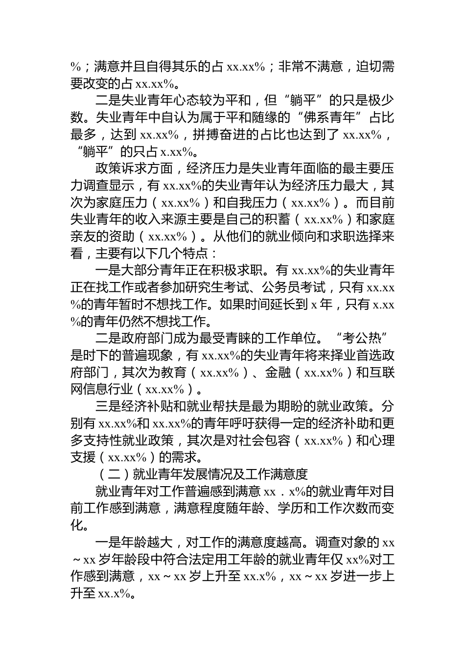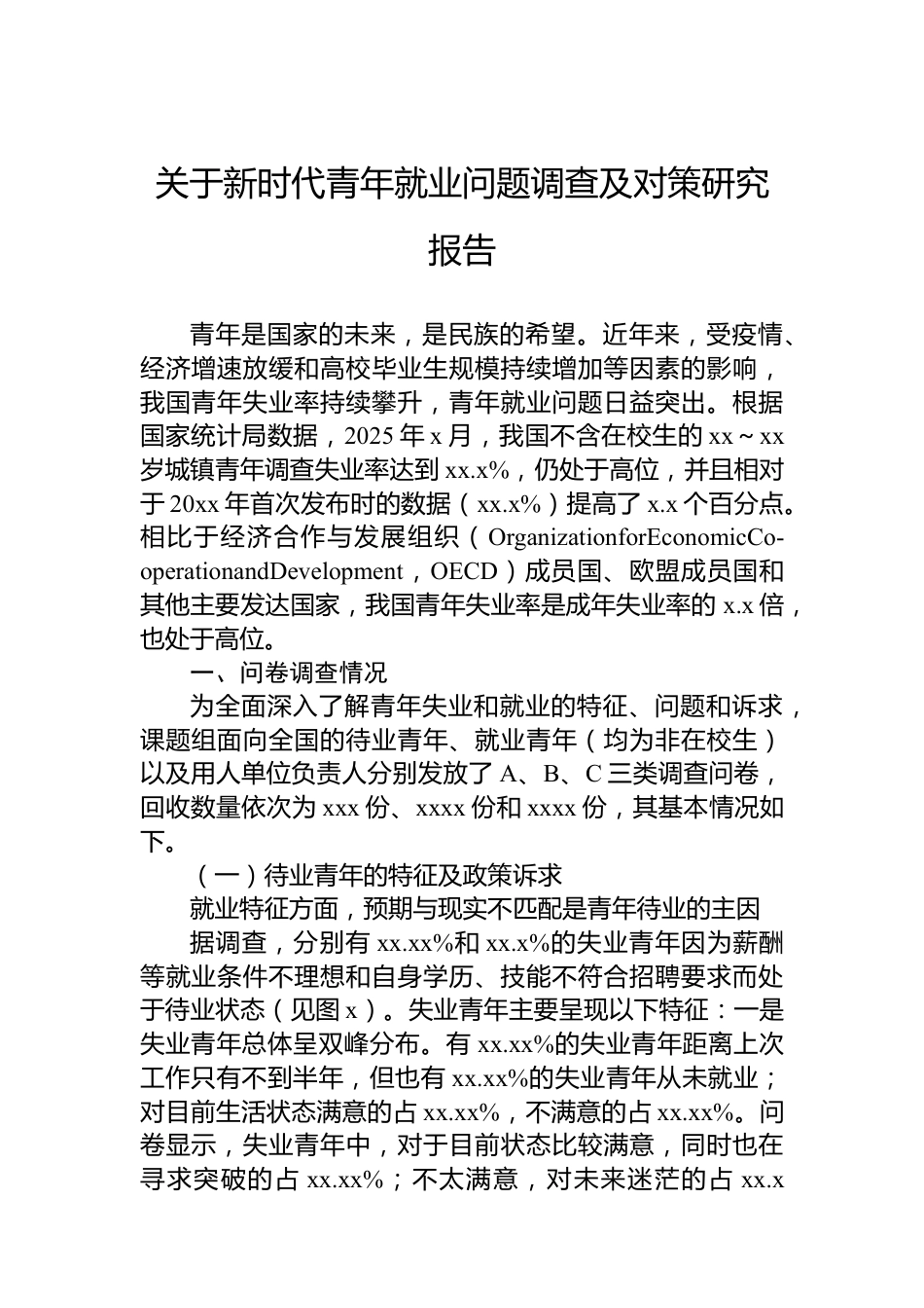 關于新時代青年就業(yè)問題調查及對策研究報告青年是國家的未來,是民族的希望。近年來,受疫情、經濟增速放緩和高校畢業(yè)生規(guī)模持續(xù)增加等因素的影響,我國青年失業(yè)率持續(xù)攀升,青年就業(yè)問題日益突出。根據國家統(tǒng)計局數據,2025年x月,我國不含在校生的xx~xx歲城鎮(zhèn)青年調查失業(yè)率達到xx.x%,仍處于高位,并且相對于20xx年首次發(fā)布時的數據(xx.x%)提高了x.x個百分點。相比于經濟合作與發(fā)展組織(OrganizationforEconomicCo-operationandDevelopment,OECD)成員國、歐盟成員國和其他主要發(fā)達國家,我國青年失業(yè)率是成年失業(yè)率的x.x倍,也處于高位。一、問卷調查情況為全面...
