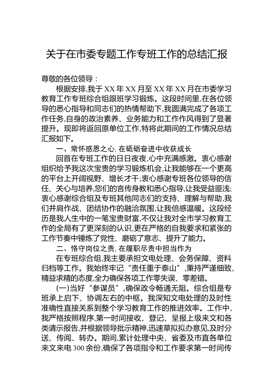 關(guān)于在市委專題工作專班工作的總結(jié)匯報