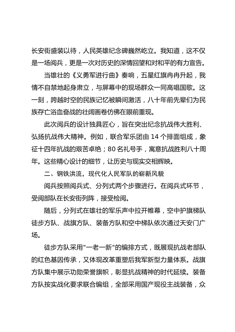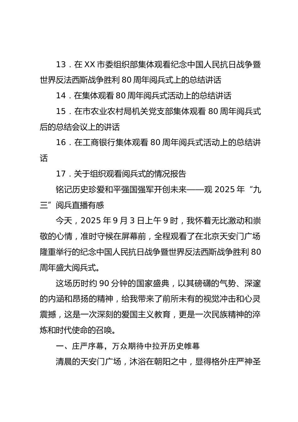 觀看抗戰(zhàn)勝利80周年盛大閱兵式心得體會和總結(jié)講話(17篇)1.銘記歷史珍愛和平強國強軍開創(chuàng)未來——觀2025年“九三”閱兵直播有感2.市長談80周年閱兵式心得體會3.銀行黨委書記觀看閱兵式心得體會4.關(guān)于學習XXX總書記在紀念抗戰(zhàn)勝利80周年閱兵式上重要講話精神的心得體會5.鎮(zhèn)黨委書記關(guān)于觀看紀念抗戰(zhàn)勝利80周年閱兵式的心得體會6.鄉(xiāng)村振興局干部觀看閱兵式心得體會7.觀看閱兵式心得體會8.辦公室干部觀看閱兵式心得體會9.XX鎮(zhèn)黨委書記學A九三閱兵式重要講話精神的心得體會10.機關(guān)干部學習XXX總書記閱兵式上重要講話精神的心得體會11.移動公司黨委書記觀看閱兵式...