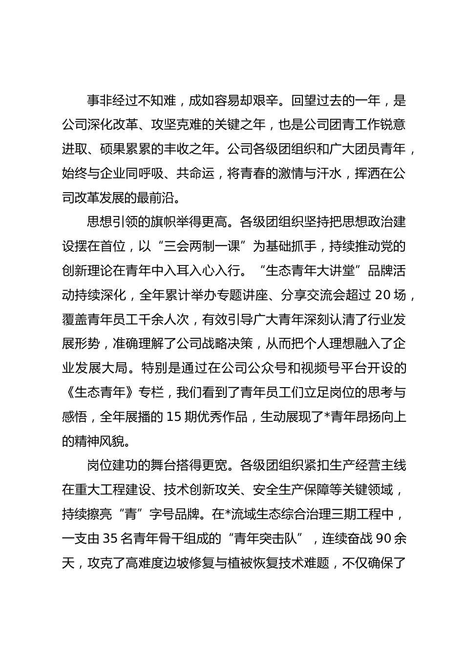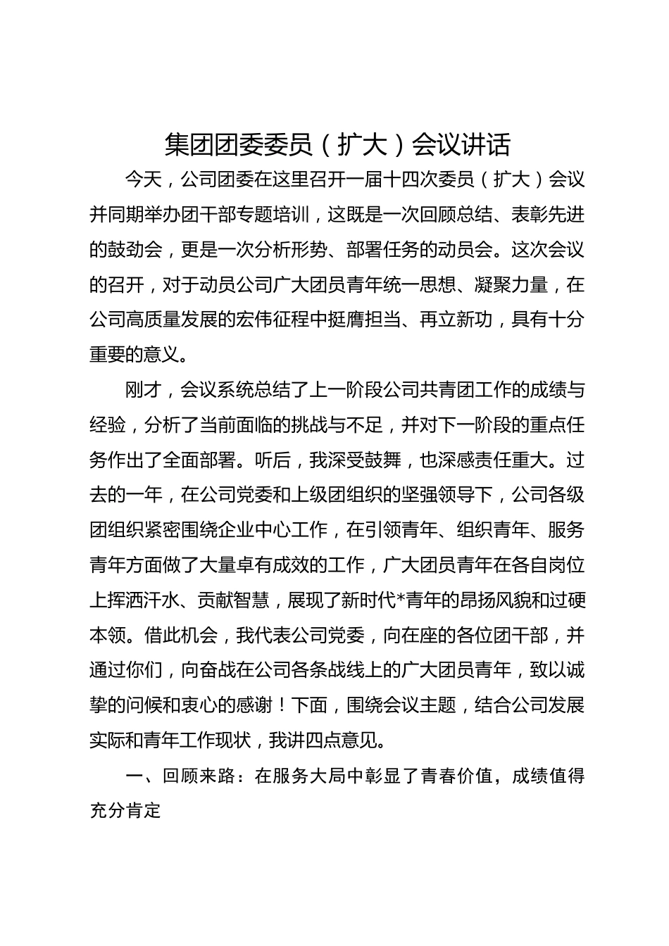 集團團委委員(擴大)會議講話今天,公司團委在這里召開一屆十四次委員(擴大)會議并同期舉辦團干部專題培訓,這既是一次回顧總結(jié)、表彰先進的鼓勁會,更是一次分析形勢、部署任務的動員會。這次會議的召開,對于動員公司廣大團員青年統(tǒng)一思想、凝聚力量,在公司高質(zhì)量發(fā)展的宏偉征程中挺膺擔當、再立新功,具有十分重要的意義。剛才,會議系統(tǒng)總結(jié)了上一階段公司共青團工作的成績與經(jīng)驗,分析了當前面臨的挑戰(zhàn)與不足,并對下一階段的重點任務作出了全面部署。聽后,我深受鼓舞,也深感責任重大。過去的一年,在公司黨委和上級團組織的堅強領導下,公司各級團組織緊密圍...