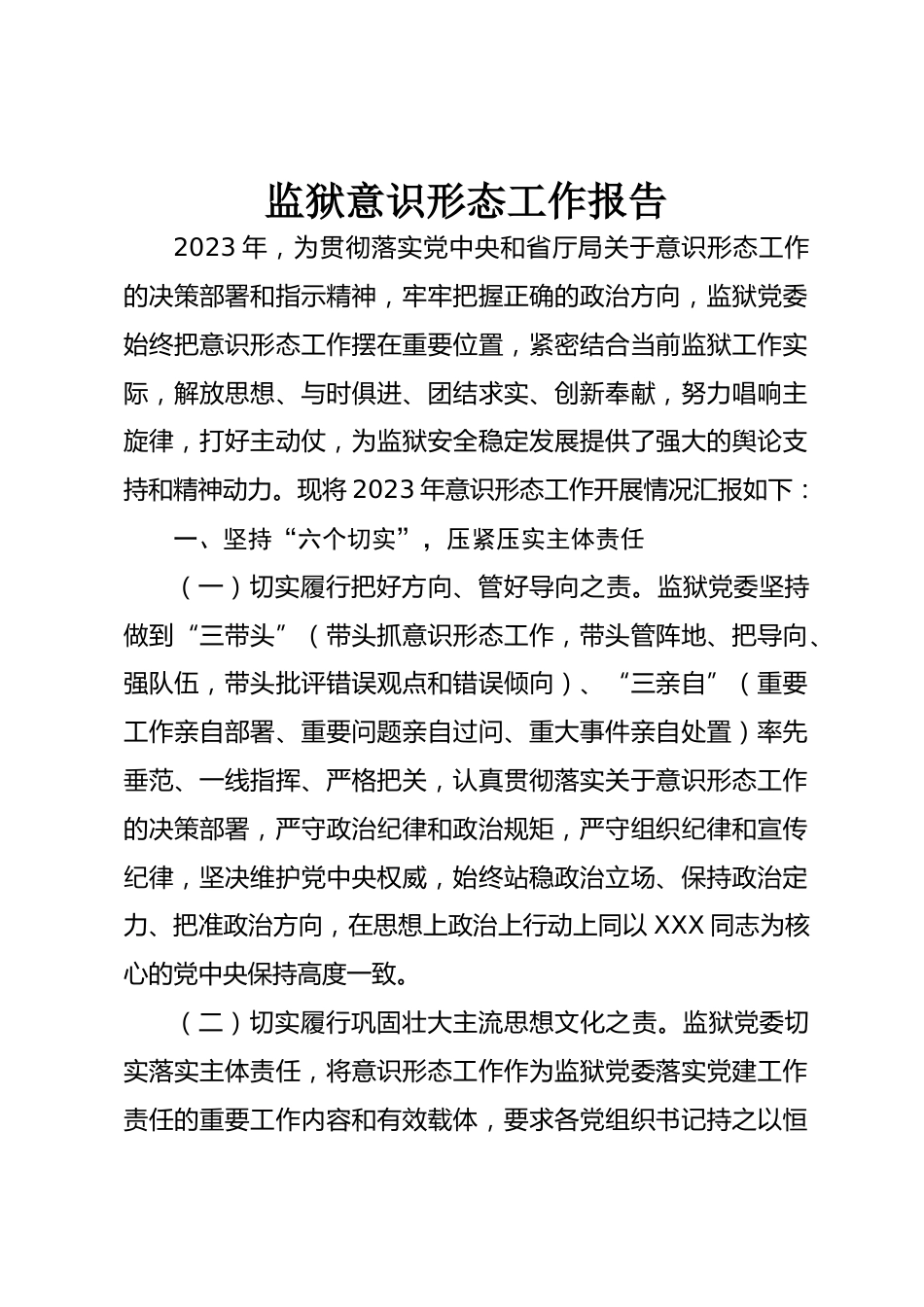 監(jiān)獄意識(shí)形態(tài)工作報(bào)告2023年,為貫徹落實(shí)黨中央和省廳局關(guān)于意識(shí)形態(tài)工作的決策部署和指示精神,牢牢把握正確的政治方向,監(jiān)獄黨委始終把意識(shí)形態(tài)工作擺在重要位置,緊密結(jié)合當(dāng)前監(jiān)獄工作實(shí)際,解放思想、與時(shí)俱進(jìn)、團(tuán)結(jié)求實(shí)、創(chuàng)新奉獻(xiàn),努力唱響主旋律,打好主動(dòng)仗,為監(jiān)獄安全穩(wěn)定發(fā)展提供了強(qiáng)大的輿論支持和精神動(dòng)力?,F(xiàn)將2023年意識(shí)形態(tài)工作開展情況匯報(bào)如下:一、堅(jiān)持“六個(gè)切實(shí)”,壓緊壓實(shí)主體責(zé)任(一)切實(shí)履行把好方向、管好導(dǎo)向之責(zé)。監(jiān)獄黨委堅(jiān)持做到“三帶頭”(帶頭抓意識(shí)形態(tài)工作,帶頭管陣地、把導(dǎo)向、強(qiáng)隊(duì)伍,帶頭批評(píng)錯(cuò)誤觀點(diǎn)和錯(cuò)誤傾向)、“三親自”...