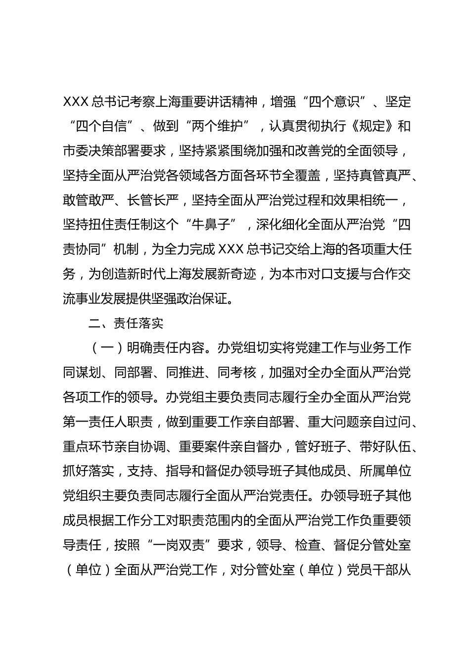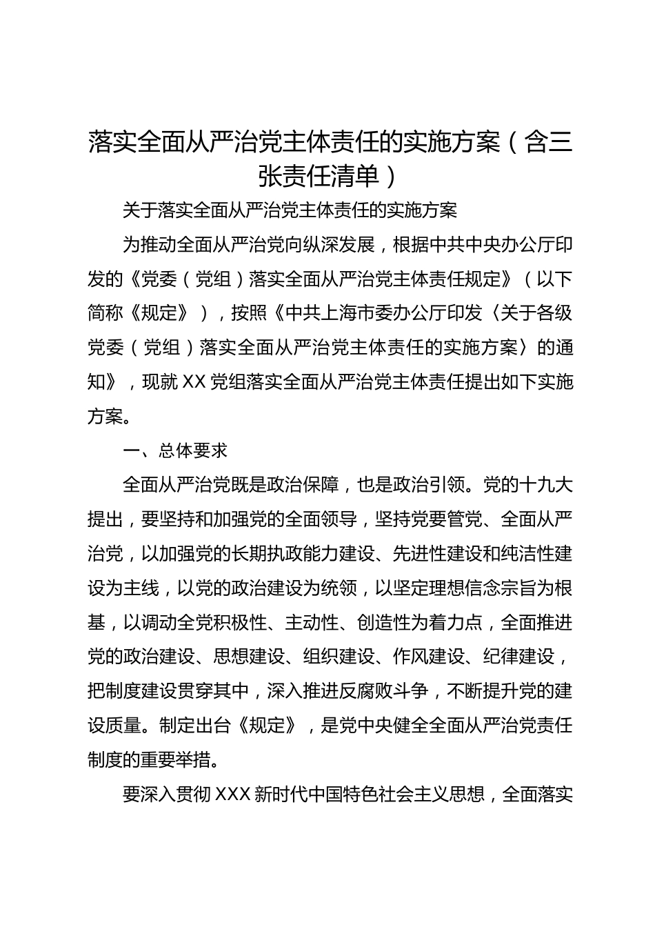 落實(shí)全面從嚴(yán)治黨主體責(zé)任的實(shí)施方案(含三張責(zé)任清單)關(guān)于落實(shí)全面從嚴(yán)治黨主體責(zé)任的實(shí)施方案為推動(dòng)全面從嚴(yán)治黨向縱深發(fā)展,根據(jù)中共中央辦公廳印發(fā)的《黨委(黨組)落實(shí)全面從嚴(yán)治黨主體責(zé)任規(guī)定》(以下簡(jiǎn)稱《規(guī)定》),按照《中共上海市委辦公廳印發(fā)〈關(guān)于各級(jí)黨委(黨組)落實(shí)全面從嚴(yán)治黨主體責(zé)任的實(shí)施方案〉的通知》,現(xiàn)就XX黨組落實(shí)全面從嚴(yán)治黨主體責(zé)任提出如下實(shí)施方案。一、總體要求全面從嚴(yán)治黨既是政治保障,也是政治引領(lǐng)。黨的十九大提出,要堅(jiān)持和加強(qiáng)黨的全面領(lǐng)導(dǎo),堅(jiān)持黨要管黨、全面從嚴(yán)治黨,以加強(qiáng)黨的長(zhǎng)期執(zhí)政能力建設(shè)、先進(jìn)性建設(shè)和純潔性建設(shè)...