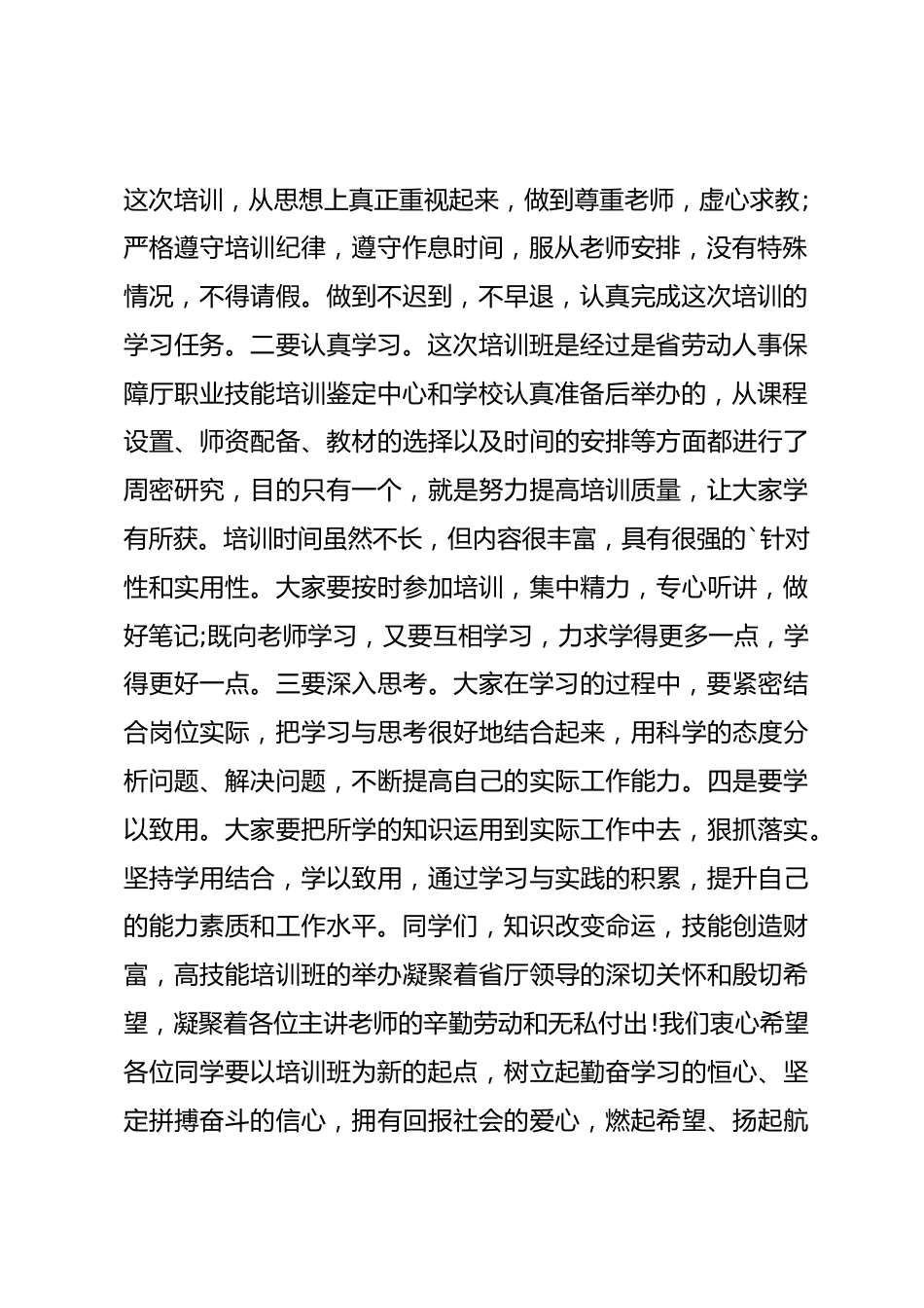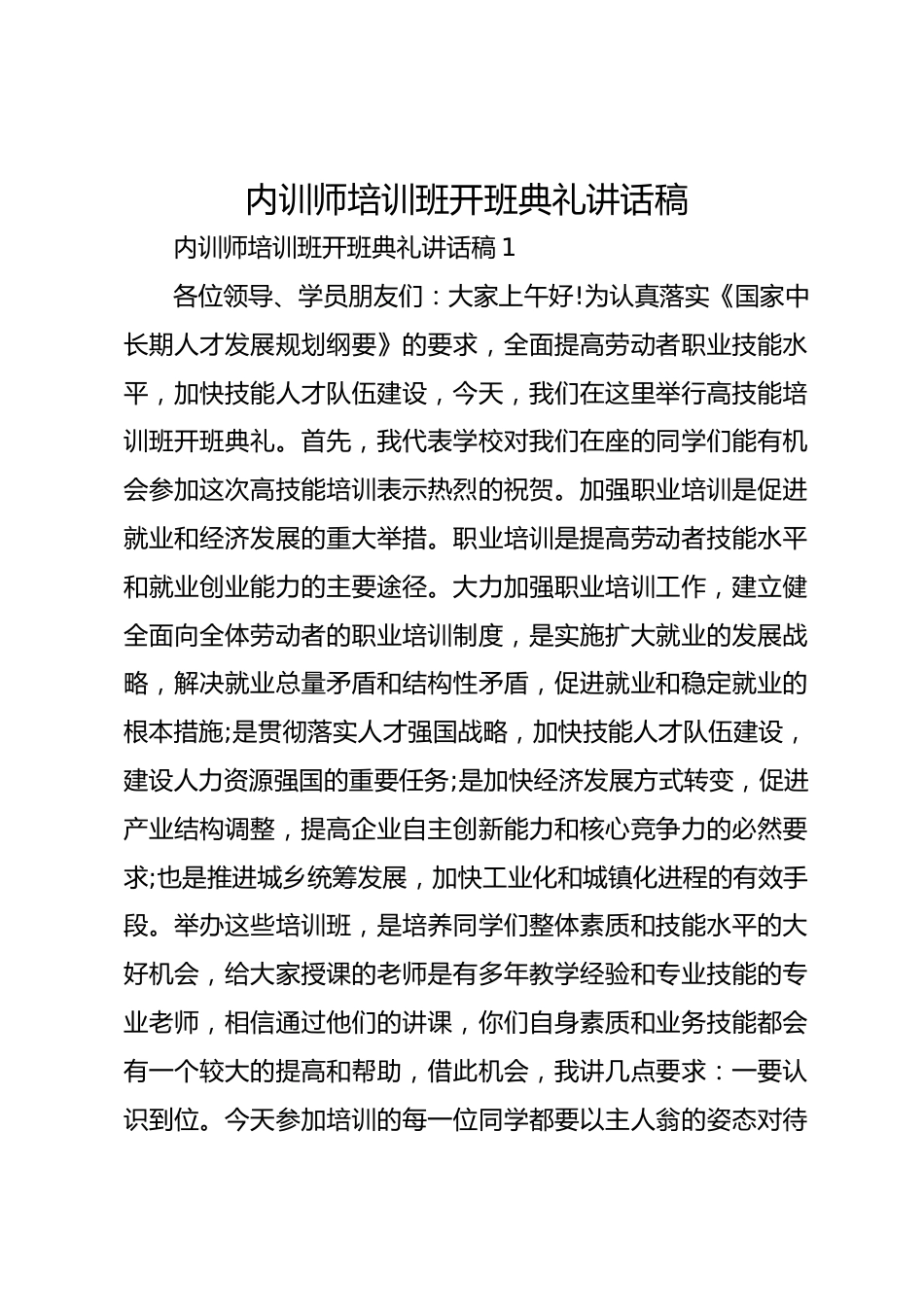 內(nèi)訓(xùn)師培訓(xùn)班開班典禮講話稿內(nèi)訓(xùn)師培訓(xùn)班開班典禮講話稿1各位領(lǐng)導(dǎo)、學(xué)員朋友們:大家上午好!為認(rèn)真落實(shí)《國家中長期人才發(fā)展規(guī)劃綱要》的要求,全面提高勞動者職業(yè)技能水平,加快技能人才隊(duì)伍建設(shè),今天,我們在這里舉行高技能培訓(xùn)班開班典禮。首先,我代表學(xué)校對我們在座的同學(xué)們能有機(jī)會參加這次高技能培訓(xùn)表示熱烈的祝賀。加強(qiáng)職業(yè)培訓(xùn)是促進(jìn)就業(yè)和經(jīng)濟(jì)發(fā)展的重大舉措。職業(yè)培訓(xùn)是提高勞動者技能水平和就業(yè)創(chuàng)業(yè)能力的主要途徑。大力加強(qiáng)職業(yè)培訓(xùn)工作,建立健全面向全體勞動者的職業(yè)培訓(xùn)制度,是實(shí)施擴(kuò)大就業(yè)的發(fā)展戰(zhàn)略,解決就業(yè)總量矛盾和結(jié)構(gòu)性矛盾,促進(jìn)就業(yè)和穩(wěn)定...
