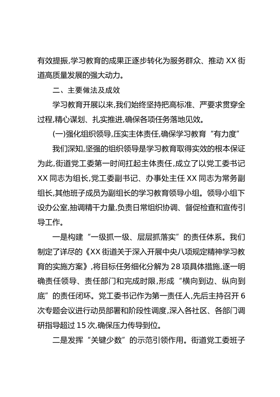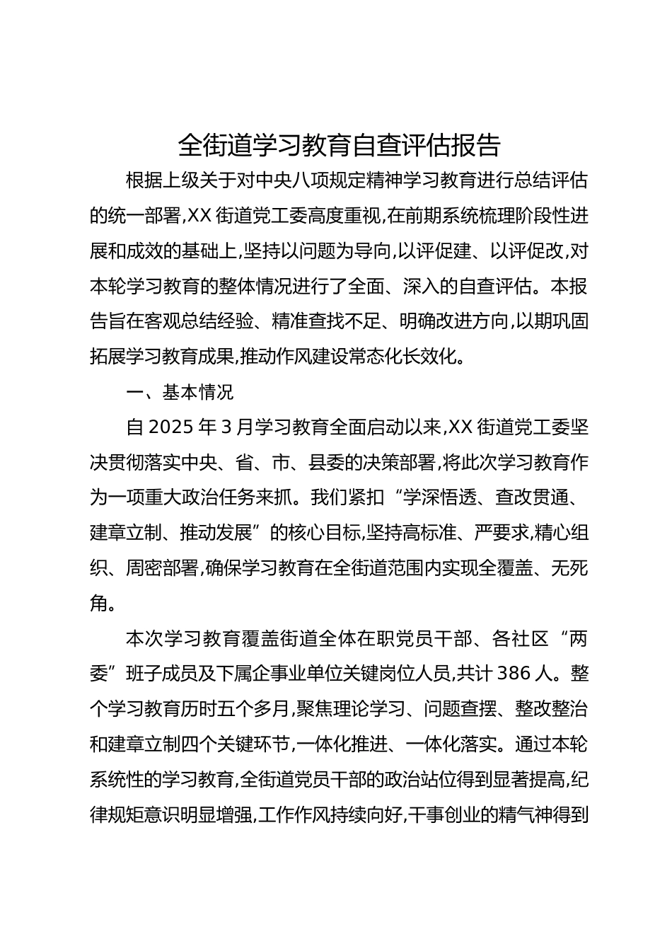 全街道學習教育自查評估報告根據(jù)上級關于對中央八項規(guī)定精神學習教育進行總結評估的統(tǒng)一部署,XX街道黨工委高度重視,在前期系統(tǒng)梳理階段性進展和成效的基礎上,堅持以問題為導向,以評促建、以評促改,對本輪學習教育的整體情況進行了全面、深入的自查評估。本報告旨在客觀總結經(jīng)驗、精準查找不足、明確改進方向,以期鞏固拓展學習教育成果,推動作風建設常態(tài)化長效化。一、基本情況自2025年3月學習教育全面啟動以來,XX街道黨工委堅決貫徹落實中央、省、市、縣委的決策部署,將此次學習教育作為一項重大政治任務來抓。我們緊扣“學深悟透、查改貫通、建章立制、推動發(fā)展”的核心...