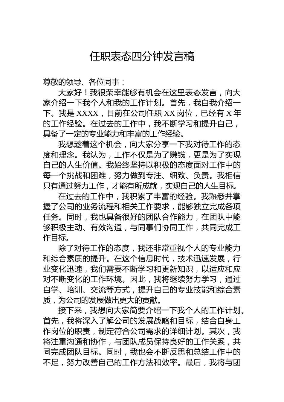 任職表態(tài)四分鐘發(fā)言稿尊敬的領導、各位同事:大家好!我很榮幸能夠有機會在這里表態(tài)發(fā)言,向大家介紹一下我個人和我的工作計劃。首先,我自我介紹一下。我是XXXX,目前在公司任職XX崗位,已經有X年的工作經驗。在過去的工作中,我不斷學習和提升自己,具備了一定的專業(yè)能力和豐富的工作經驗。我想趁著這個機會,向大家分享一下我對待工作的態(tài)度和理念。我認為,工作不僅是為了賺錢,更是為了實現自己的人生價值。我始終堅持以積極的態(tài)度面對工作中的每一個挑戰(zhàn)和困難,努力做到專注、細致、負責。我相信只有通過努力工作,才能有所成就,實現自己的人生目標。在過去的工...