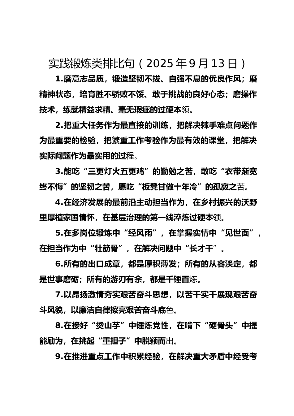 實(shí)踐鍛煉類排比句(2025年9月13日)1.磨意志品質(zhì),鍛造堅(jiān)韌不拔、自強(qiáng)不息的優(yōu)良作風(fēng);磨精神狀態(tài),培育勝不驕敗不餒、敢于挑戰(zhàn)的良好心態(tài);磨操作技術(shù),練就精益求精、毫無瑕疵的過硬本領(lǐng)。2.把重大任務(wù)作為最直接的訓(xùn)練,把解決棘手難點(diǎn)問題作為最重要的檢驗(yàn),把繁重工作考驗(yàn)作為最有效的課堂,把解決實(shí)際問題作為最實(shí)用的過程。3.能吃“三更燈火五更雞”的勤勉之苦,敢吃“衣帶漸寬終不悔”的堅(jiān)韌之苦,愿吃“板凳甘做十年冷”的孤寂之苦。4.在經(jīng)濟(jì)發(fā)展的最前沿主動擔(dān)當(dāng)作為,在鄉(xiāng)村振興的沃野里厚植家國情懷,在基層治理的第一線淬煉過硬本領(lǐng)。5.在多崗位鍛煉中“經(jīng)...