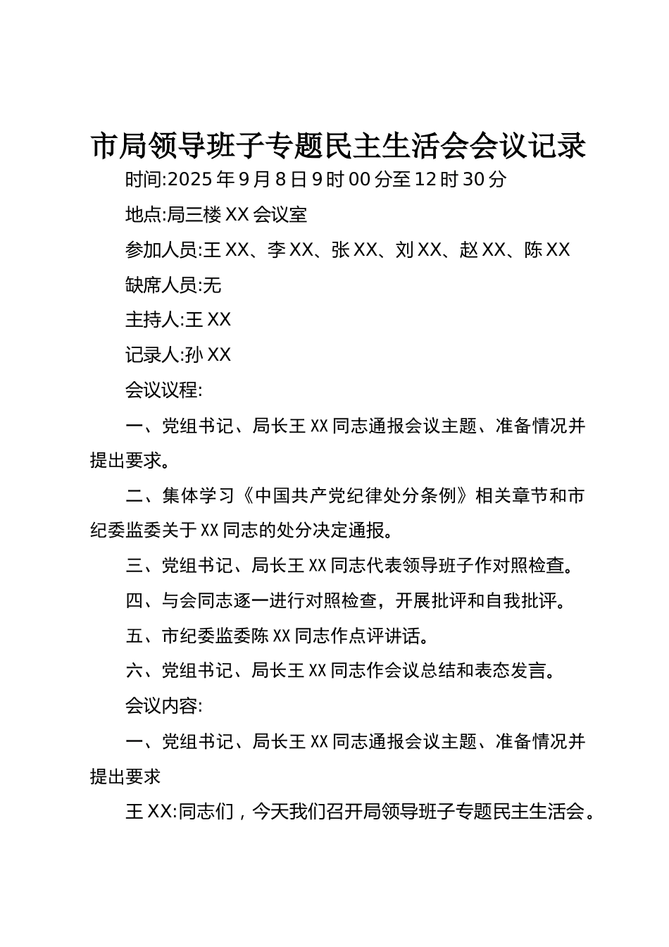 市局領(lǐng)導班子專題民主生活會會議記錄時間:2025年9月8日9時00分至12時30分地點:局三樓XX會議室參加人員:王XX、李XX、張XX、劉XX、趙XX、陳XX缺席人員:無主持人:王XX記錄人:孫XX會議議程:一、黨組書記、局長王XX同志通報會議主題、準備情況并提出要求。二、集體學習《中國共產(chǎn)黨紀律處分條例》相關(guān)章節(jié)和市紀委監(jiān)委關(guān)于XX同志的處分決定通報。三、黨組書記、局長王XX同志代表領(lǐng)導班子作對照檢查。四、與會同志逐一進行對照檢查,開展批評和自我批評。五、市紀委監(jiān)委陳XX同志作點評講話。六、黨組書記、局長王XX同志作會議總結(jié)和表態(tài)發(fā)言。會議內(nèi)容:一、黨組書記、局長王XX...