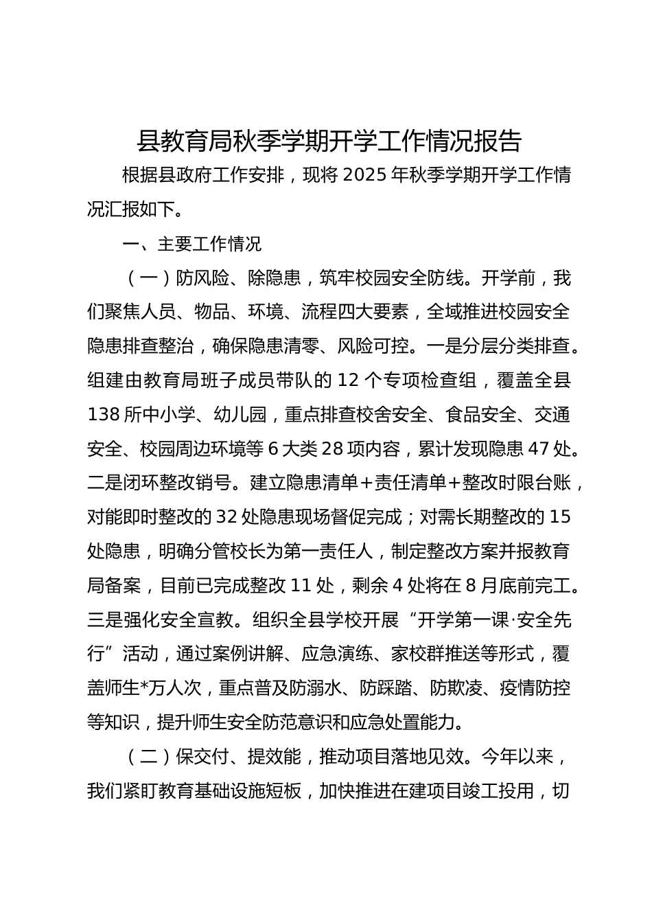 縣教育局秋季學期開學工作情況報告根據(jù)縣政府工作安排,現(xiàn)將2025年秋季學期開學工作情況匯報如下。一、主要工作情況(一)防風險、除隱患,筑牢校園安全防線。開學前,我們聚焦人員、物品、環(huán)境、流程四大要素,全域推進校園安全隱患排查整治,確保隱患清零、風險可控。一是分層分類排查。組建由教育局班子成員帶隊的12個專項檢查組,覆蓋全縣138所中小學、幼兒園,重點排查校舍安全、食品安全、交通安全、校園周邊環(huán)境等6大類28項內容,累計發(fā)現(xiàn)隱患47處。二是閉環(huán)整改銷號。建立隱患清單+責任清單+整改時限臺賬,對能即時整改的32處隱患現(xiàn)場督促完成;對需長期整改的15...