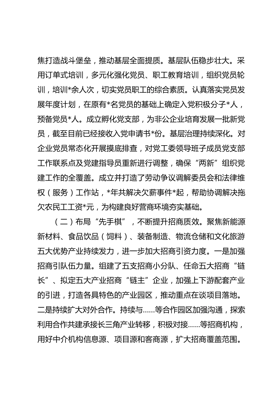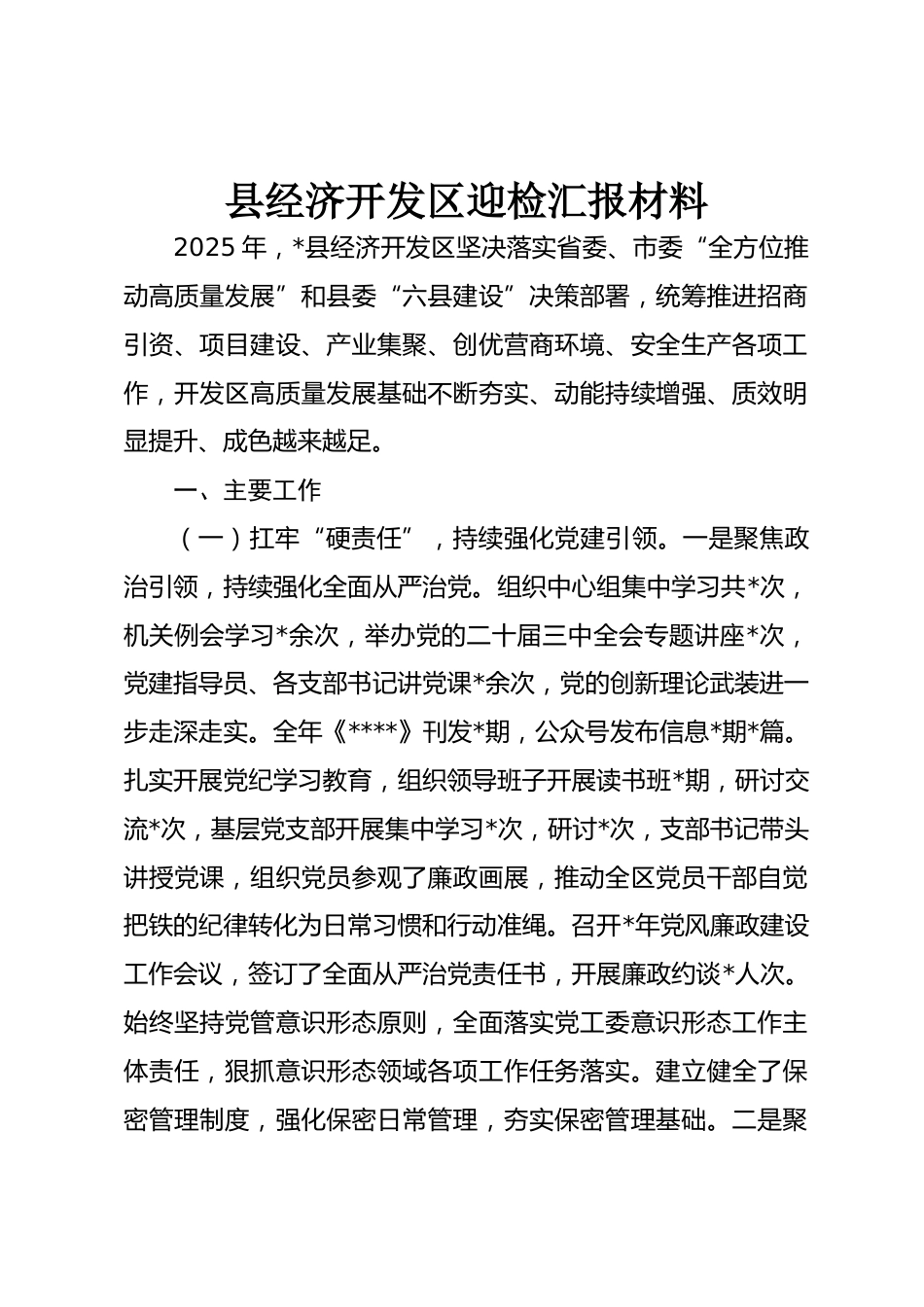 縣經(jīng)濟(jì)開發(fā)區(qū)迎檢匯報(bào)材料2025年,*縣經(jīng)濟(jì)開發(fā)區(qū)堅(jiān)決落實(shí)省委、市委“全方位推動(dòng)高質(zhì)量發(fā)展”和縣委“六縣建設(shè)”決策部署,統(tǒng)籌推進(jìn)招商引資、項(xiàng)目建設(shè)、產(chǎn)業(yè)集聚、創(chuàng)優(yōu)營(yíng)商環(huán)境、安全生產(chǎn)各項(xiàng)工作,開發(fā)區(qū)高質(zhì)量發(fā)展基礎(chǔ)不斷夯實(shí)、動(dòng)能持續(xù)增強(qiáng)、質(zhì)效明顯提升、成色越來越足。一、主要工作(一)扛牢“硬責(zé)任”,持續(xù)強(qiáng)化黨建引領(lǐng)。一是聚焦政治引領(lǐng),持續(xù)強(qiáng)化全面從嚴(yán)治黨。組織中心組集中學(xué)習(xí)共*次,機(jī)關(guān)例會(huì)學(xué)習(xí)*余次,舉辦黨的二十屆三中全會(huì)專題講座*次,黨建指導(dǎo)員、各支部書記講黨課*余次,黨的創(chuàng)新理論武裝進(jìn)一步走深走實(shí)。全年《****》刊發(fā)*期,公眾號(hào)發(fā)布信息...