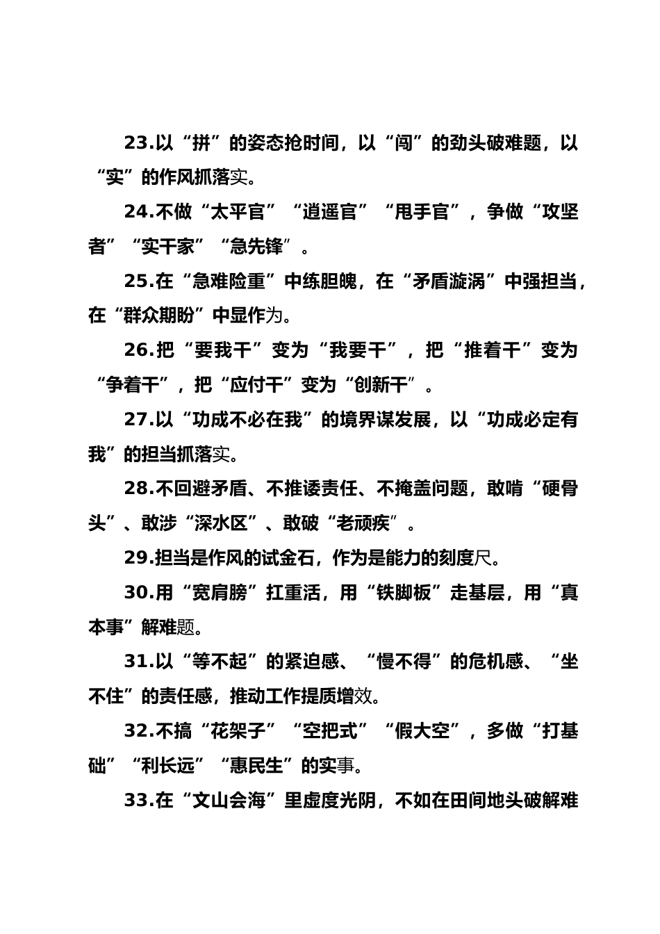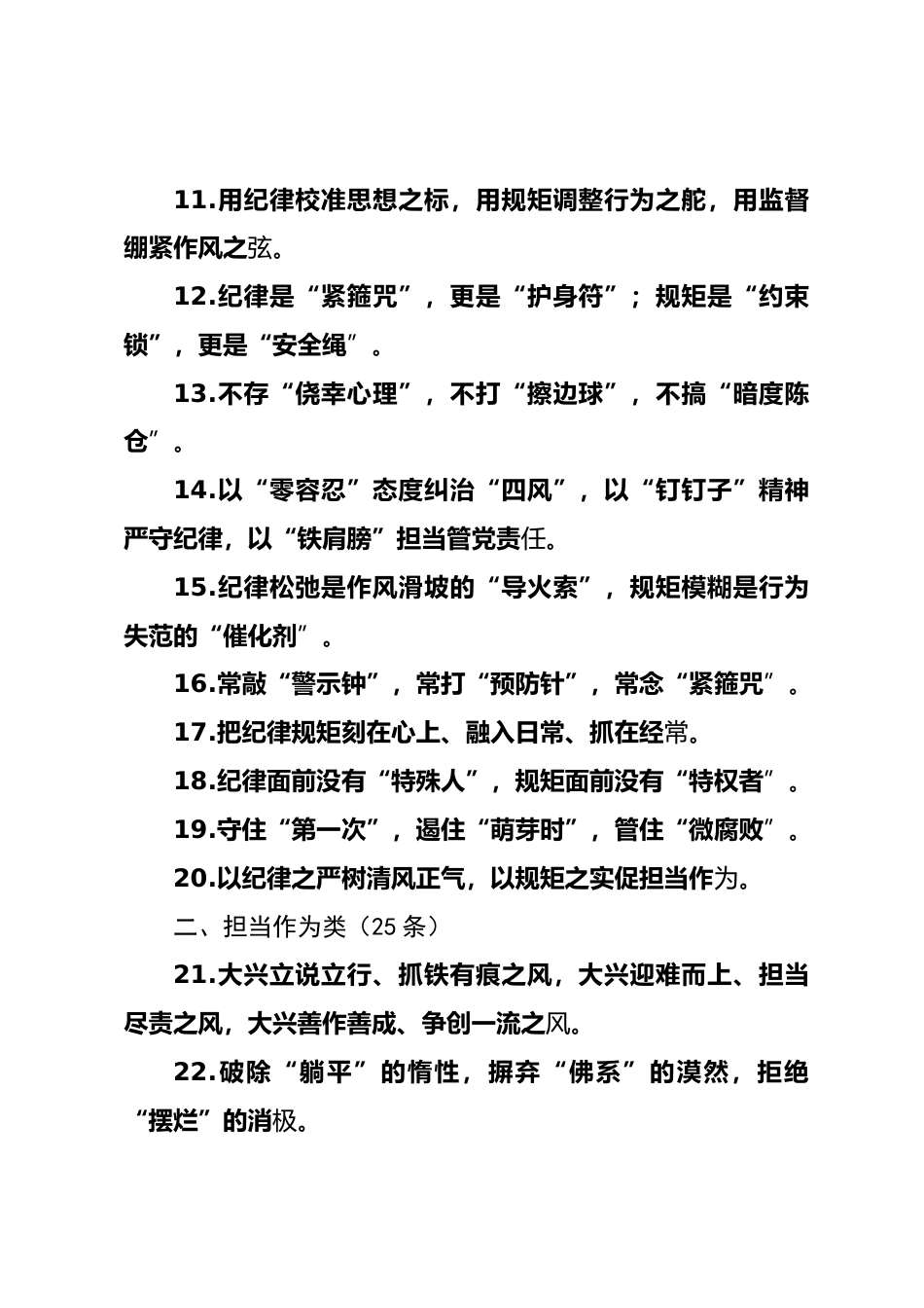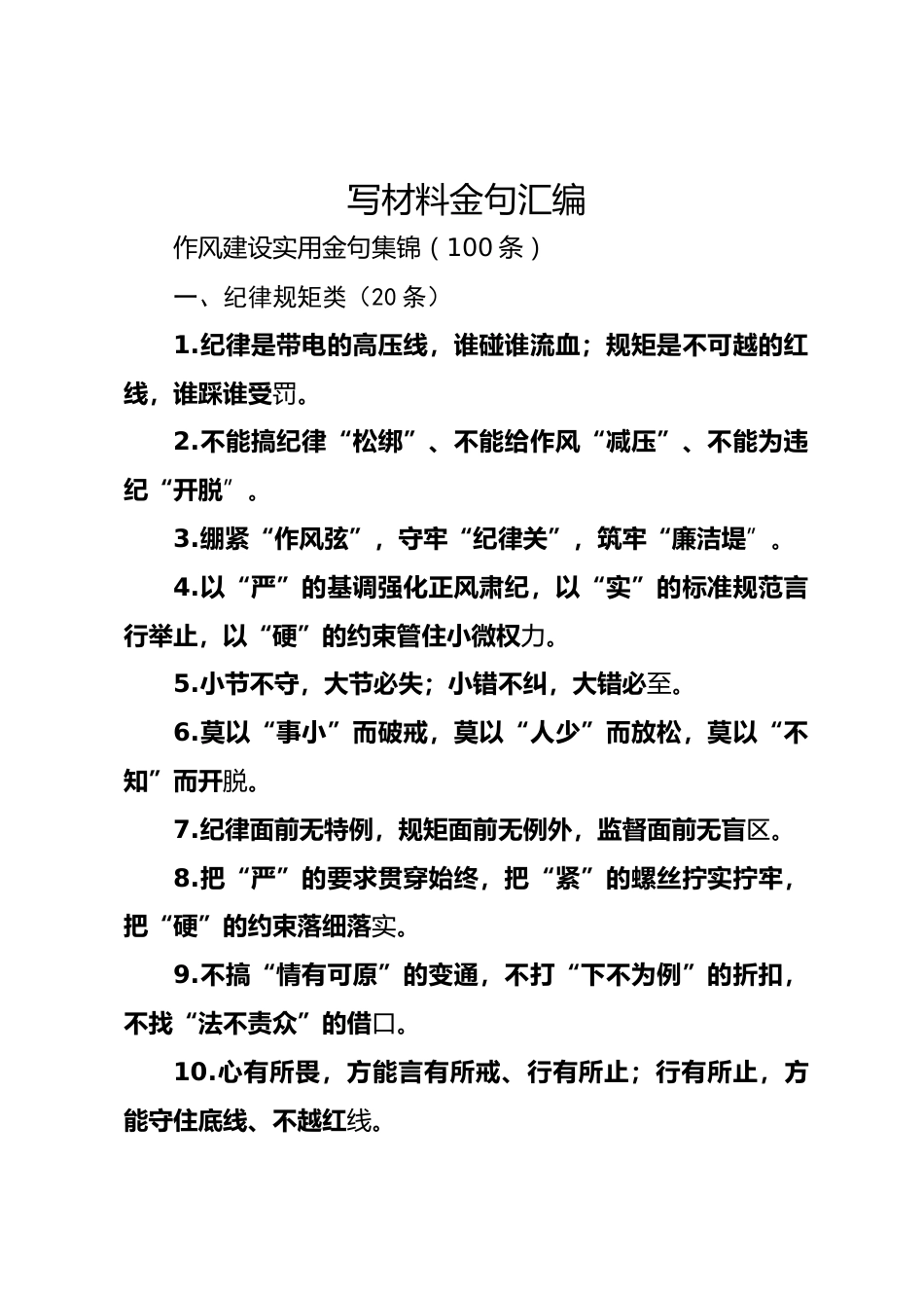 寫(xiě)材料金句匯編作風(fēng)建設(shè)實(shí)用金句集錦(100條)一、紀(jì)律規(guī)矩類(lèi)(20條)1.紀(jì)律是帶電的高壓線,誰(shuí)碰誰(shuí)流血;規(guī)矩是不可越的紅線,誰(shuí)踩誰(shuí)受罰。2.不能搞紀(jì)律“松綁”、不能給作風(fēng)“減壓”、不能為違紀(jì)“開(kāi)脫”。3.繃緊“作風(fēng)弦”,守牢“紀(jì)律關(guān)”,筑牢“廉潔堤”。4.以“嚴(yán)”的基調(diào)強(qiáng)化正風(fēng)肅紀(jì),以“實(shí)”的標(biāo)準(zhǔn)規(guī)范言行舉止,以“硬”的約束管住小微權(quán)力。5.小節(jié)不守,大節(jié)必失;小錯(cuò)不糾,大錯(cuò)必至。6.莫以“事小”而破戒,莫以“人少”而放松,莫以“不知”而開(kāi)脫。7.紀(jì)律面前無(wú)特例,規(guī)矩面前無(wú)例外,監(jiān)督面前無(wú)盲區(qū)。8.把“嚴(yán)”的要求貫穿始終,把“緊”的螺絲擰實(shí)擰...