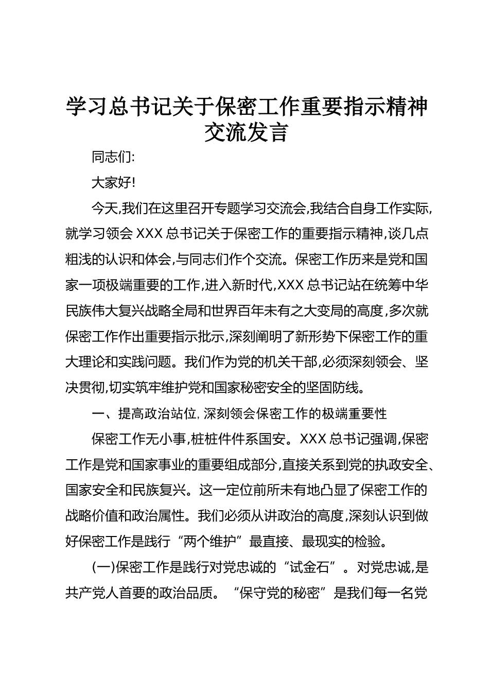 學習總書記關于保密工作重要指示精神交流發(fā)言同志們:大家好!今天,我們在這里召開專題學習交流會,我結合自身工作實際,就學習領會XXX總書記關于保密工作的重要指示精神,談幾點粗淺的認識和體會,與同志們作個交流。保密工作歷來是黨和國家一項極端重要的工作,進入新時代,XXX總書記站在統(tǒng)籌中華民族偉大復興戰(zhàn)略全局和世界百年未有之大變局的高度,多次就保密工作作出重要指示批示,深刻闡明了新形勢下保密工作的重大理論和實踐問題。我們作為黨的機關干部,必須深刻領會、堅決貫徹,切實筑牢維護黨和國家秘密安全的堅固防線。一、提高政治站位,深刻領會保密工作的極端重要性保密...