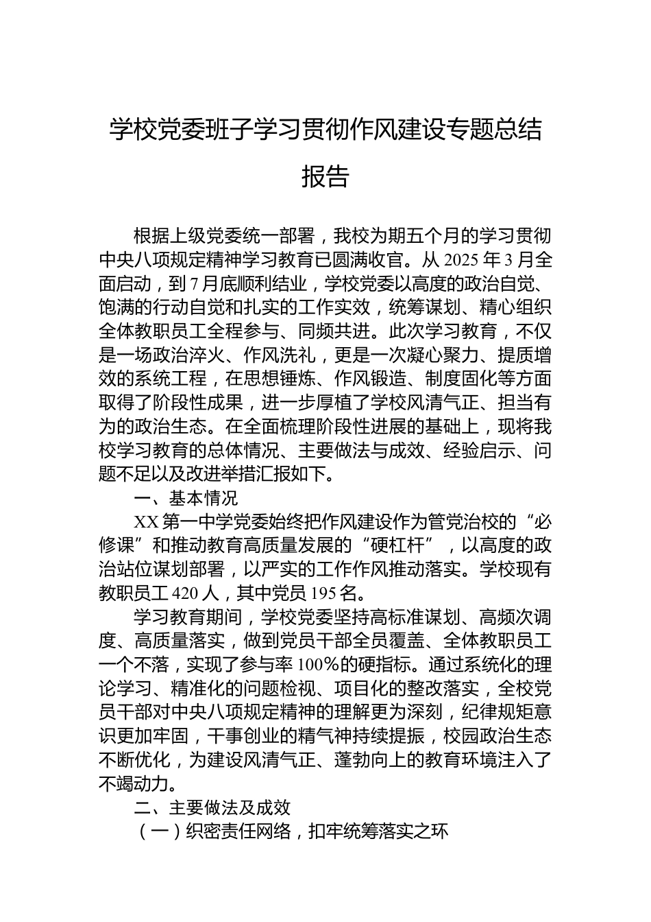 學(xué)校黨委班子學(xué)習(xí)貫徹作風(fēng)建設(shè)專題總結(jié)報(bào)告根據(jù)上級(jí)黨委統(tǒng)一部署,我校為期五個(gè)月的學(xué)習(xí)貫徹中央八項(xiàng)規(guī)定精神學(xué)習(xí)教育已圓滿收官。從2025年3月全面啟動(dòng),到7月底順利結(jié)業(yè),學(xué)校黨委以高度的政治自覺、飽滿的行動(dòng)自覺和扎實(shí)的工作實(shí)效,統(tǒng)籌謀劃、精心組織全體教職員工全程參與、同頻共進(jìn)。此次學(xué)習(xí)教育,不僅是一場(chǎng)政治淬火、作風(fēng)洗禮,更是一次凝心聚力、提質(zhì)增效的系統(tǒng)工程,在思想錘煉、作風(fēng)鍛造、制度固化等方面取得了階段性成果,進(jìn)一步厚植了學(xué)校風(fēng)清氣正、擔(dān)當(dāng)有為的政治生態(tài)。在全面梳理階段性進(jìn)展的基礎(chǔ)上,現(xiàn)將我校學(xué)習(xí)教育的總體情況、主要做法與成效、經(jīng)驗(yàn)啟...