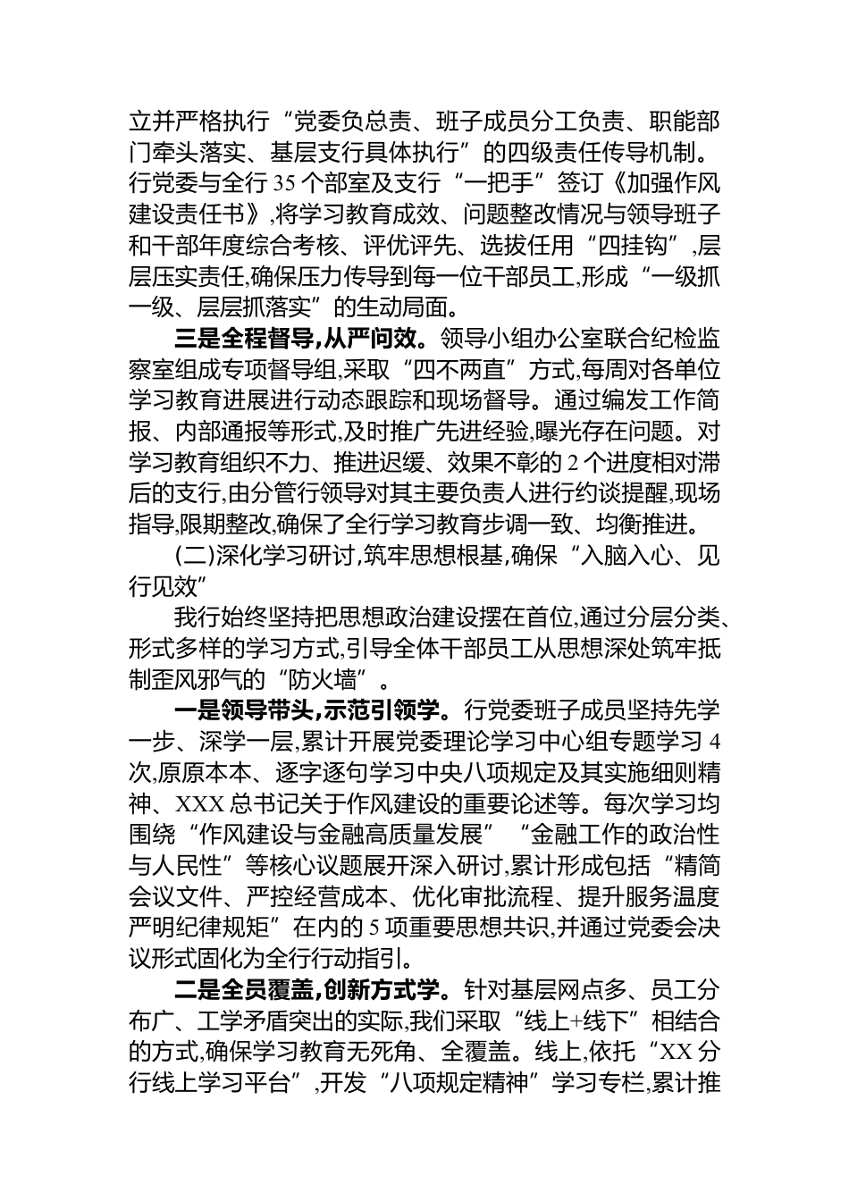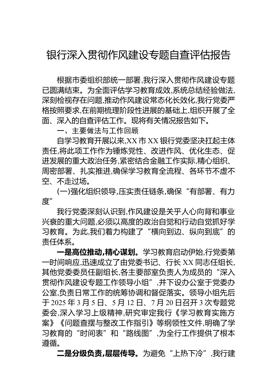 銀行深入貫徹作風(fēng)建設(shè)專題自查評(píng)估報(bào)告根據(jù)市委組織部統(tǒng)一部署,我行深入貫徹作風(fēng)建設(shè)專題已圓滿結(jié)束。為全面評(píng)估學(xué)習(xí)教育成效,系統(tǒng)總結(jié)經(jīng)驗(yàn)做法,深刻檢視存在問(wèn)題,推動(dòng)作風(fēng)建設(shè)常態(tài)化長(zhǎng)效化,我行黨委嚴(yán)格按照要求,在前期梳理階段性進(jìn)展的基礎(chǔ)上,組織開(kāi)展了全面、深入的自查評(píng)估工作?,F(xiàn)將有關(guān)情況報(bào)告如下。一、主要做法與工作回顧自學(xué)習(xí)教育開(kāi)展以來(lái),XX市XX銀行黨委堅(jiān)決扛起主體責(zé)任,將此項(xiàng)工作作為錘煉黨性、改進(jìn)作風(fēng)、優(yōu)化生態(tài)、促進(jìn)發(fā)展的重大政治任務(wù),緊密結(jié)合金融工作實(shí)際,精心組織、周密部署、扎實(shí)推進(jìn),確保學(xué)習(xí)教育全流程、各環(huán)節(jié)不虛不空、不走過(guò)場(chǎng)。(一)強(qiáng)化組...