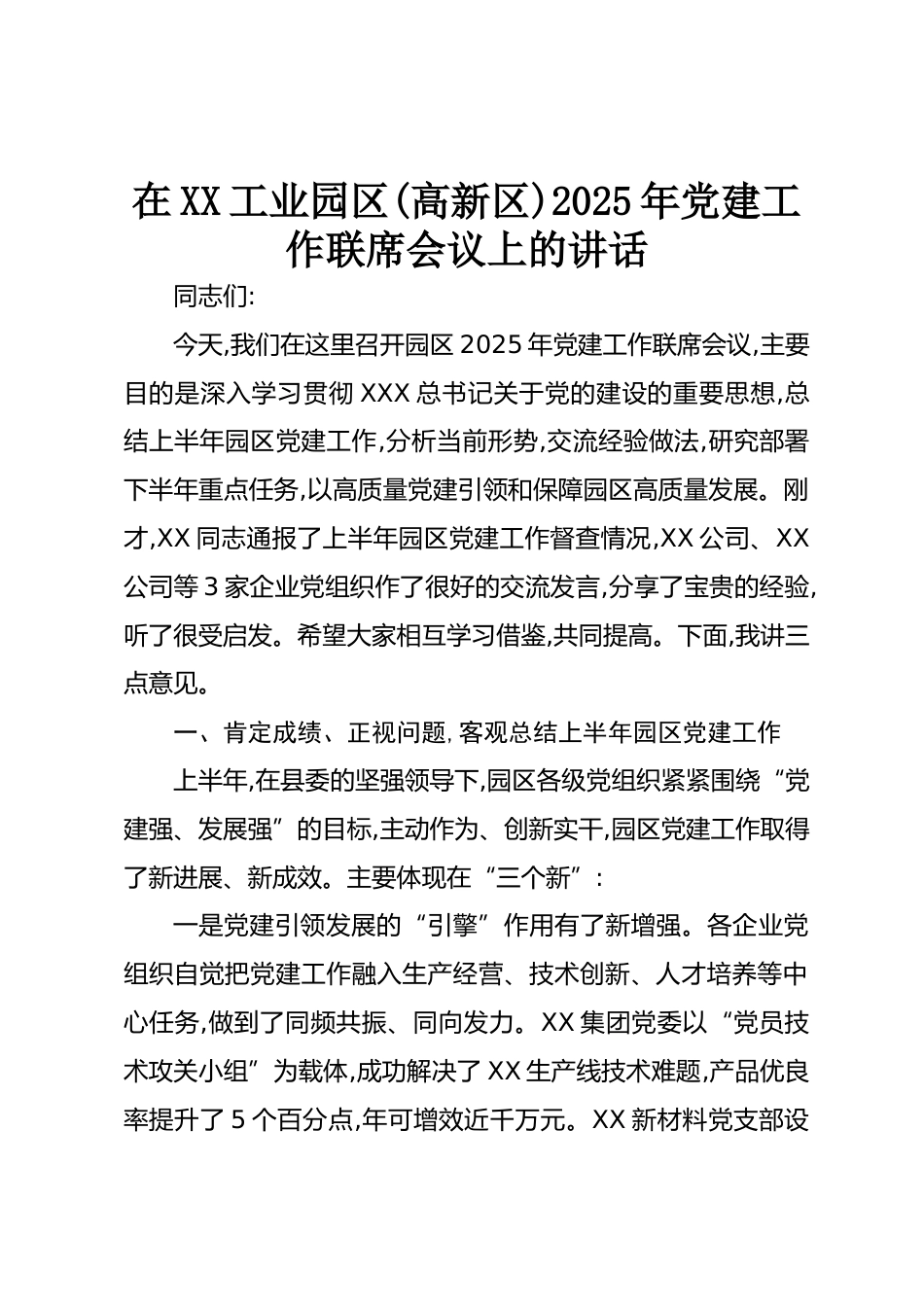 在XX工業(yè)園區(qū)(高新區(qū))2025年黨建工作聯(lián)席會(huì)議上的講話同志們:今天,我們?cè)谶@里召開園區(qū)2025年黨建工作聯(lián)席會(huì)議,主要目的是深入學(xué)習(xí)貫徹XXX總書記關(guān)于黨的建設(shè)的重要思想,總結(jié)上半年園區(qū)黨建工作,分析當(dāng)前形勢(shì),交流經(jīng)驗(yàn)做法,研究部署下半年重點(diǎn)任務(wù),以高質(zhì)量黨建引領(lǐng)和保障園區(qū)高質(zhì)量發(fā)展。剛才,XX同志通報(bào)了上半年園區(qū)黨建工作督查情況,XX公司、XX公司等3家企業(yè)黨組織作了很好的交流發(fā)言,分享了寶貴的經(jīng)驗(yàn),聽了很受啟發(fā)。希望大家相互學(xué)習(xí)借鑒,共同提高。下面,我講三點(diǎn)意見。一、肯定成績(jī)、正視問題,客觀總結(jié)上半年園區(qū)黨建工作上半年,在縣委的堅(jiān)強(qiáng)領(lǐng)導(dǎo)下,園區(qū)各級(jí)黨組織...