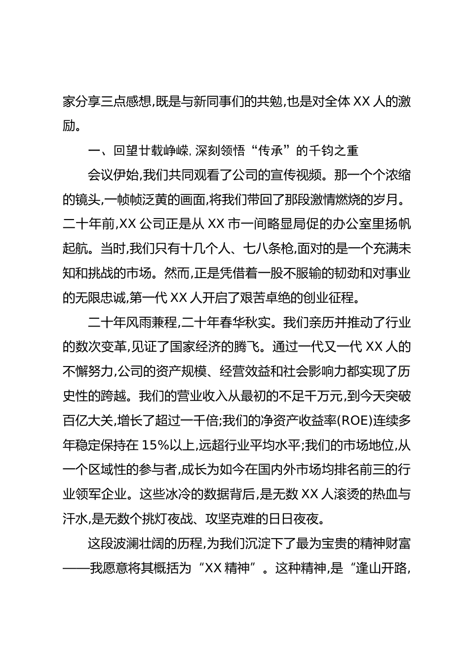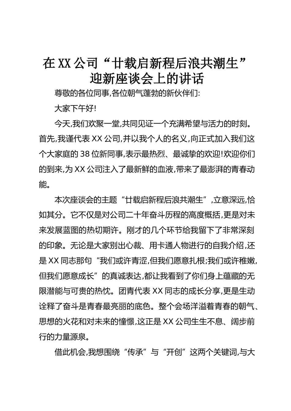 在XX公司“廿載啟新程后浪共潮生”迎新座談會上的講話