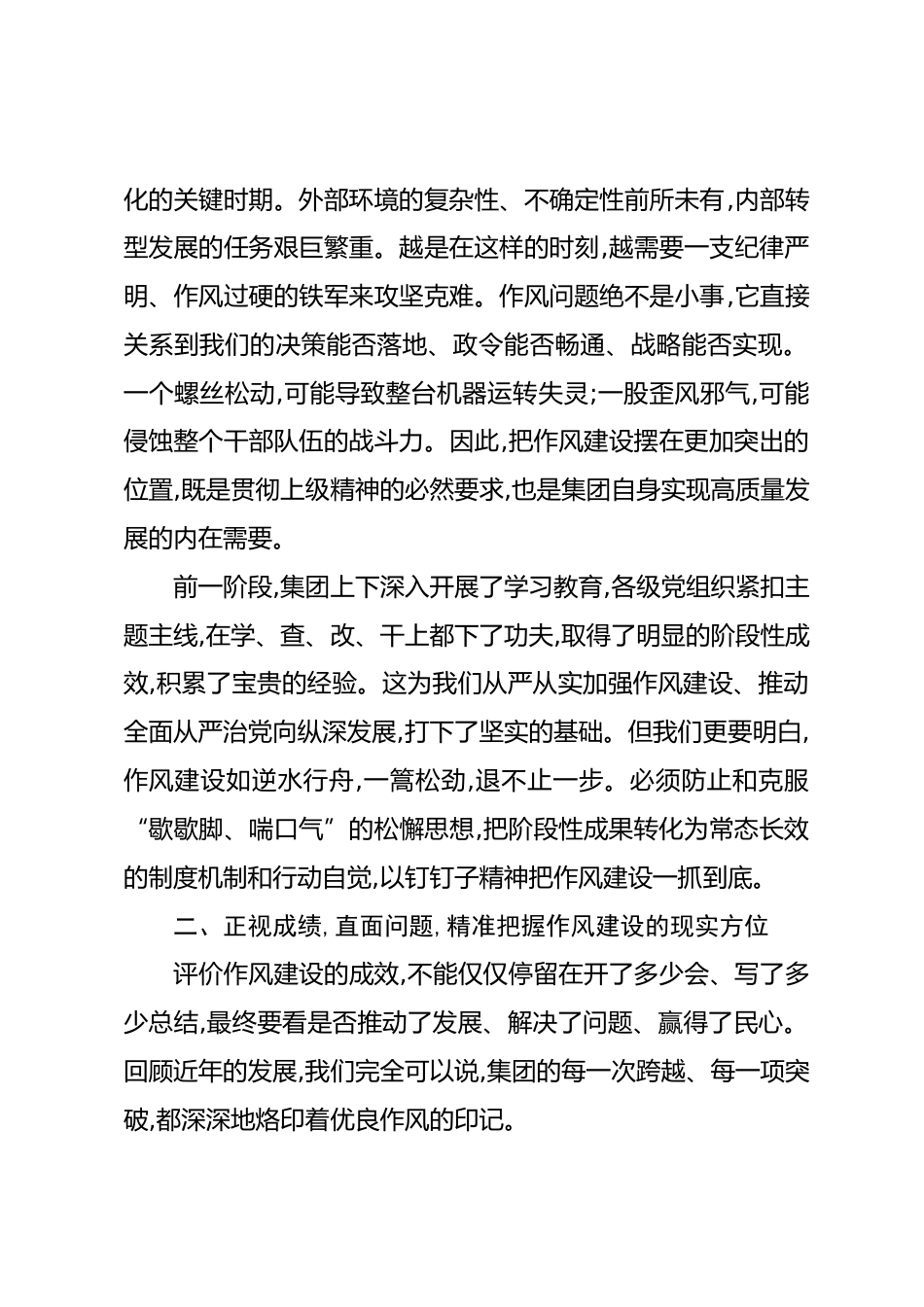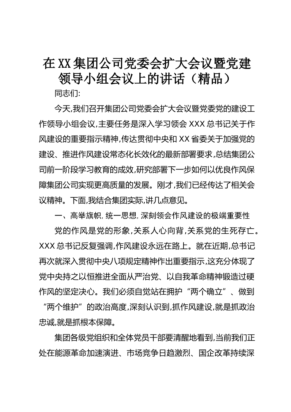 在XX集團(tuán)公司黨委會(huì)擴(kuò)大會(huì)議暨黨建領(lǐng)導(dǎo)小組會(huì)議上的講話(精品)同志們:今天,我們召開集團(tuán)公司黨委會(huì)擴(kuò)大會(huì)議暨黨委黨的建設(shè)工作領(lǐng)導(dǎo)小組會(huì)議,主要任務(wù)是深入學(xué)習(xí)領(lǐng)會(huì)XXX總書記關(guān)于作風(fēng)建設(shè)的重要指示精神,傳達(dá)貫徹中央和XX省委關(guān)于加強(qiáng)黨的建設(shè)、推進(jìn)作風(fēng)建設(shè)常態(tài)化長效化的最新部署要求,總結(jié)集團(tuán)公司前一階段學(xué)習(xí)教育的成效,研究部署下一步如何以優(yōu)良作風(fēng)保障集團(tuán)公司實(shí)現(xiàn)更高質(zhì)量的發(fā)展。剛才,我們已經(jīng)傳達(dá)了相關(guān)會(huì)議精神。下面,我結(jié)合集團(tuán)實(shí)際,講幾點(diǎn)意見。一、高舉旗幟,統(tǒng)一思想,深刻領(lǐng)會(huì)作風(fēng)建設(shè)的極端重要性黨的作風(fēng)是黨的形象,關(guān)系人心向背,關(guān)系黨的生死存亡。XX...
