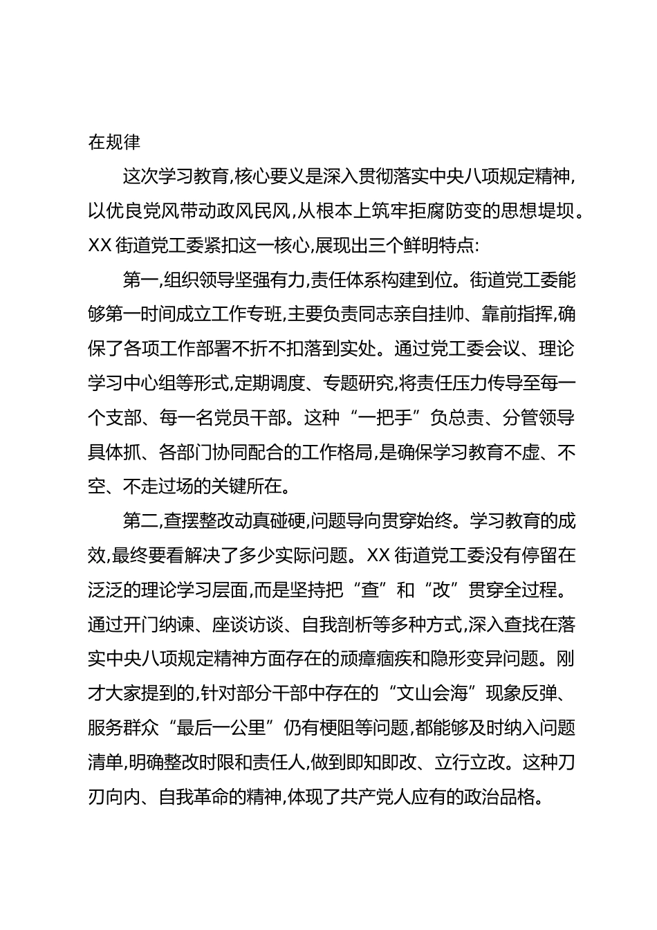 在XX街道黨工委學(xué)習(xí)教育評估座談會上的講話同志們:今天,我們在這里召開XX單位學(xué)習(xí)教育評估座談會,主要目的是全面回顧前一階段學(xué)習(xí)教育的進(jìn)展與成效,深入分析當(dāng)前存在的不足與挑戰(zhàn),并對下一步工作進(jìn)行再動員、再部署。剛才,聽取了XX街道黨工委關(guān)于學(xué)習(xí)教育工作開展情況的匯報,也聽取了來自紀(jì)工委、業(yè)務(wù)中心以及人大代表、黨員和群眾代表的發(fā)言,大家的發(fā)言準(zhǔn)備充分、內(nèi)容詳實(shí),既有對工作成果的肯定,也提出了很多寶貴的意見建議。整個會議氛圍熱烈、討論深入,充分體現(xiàn)了大家直面問題的勇氣和推動工作的決心??偟膩砜?自學(xué)習(xí)教育工作啟動以來,XX街道黨工委能夠嚴(yán)格對標(biāo)上級...