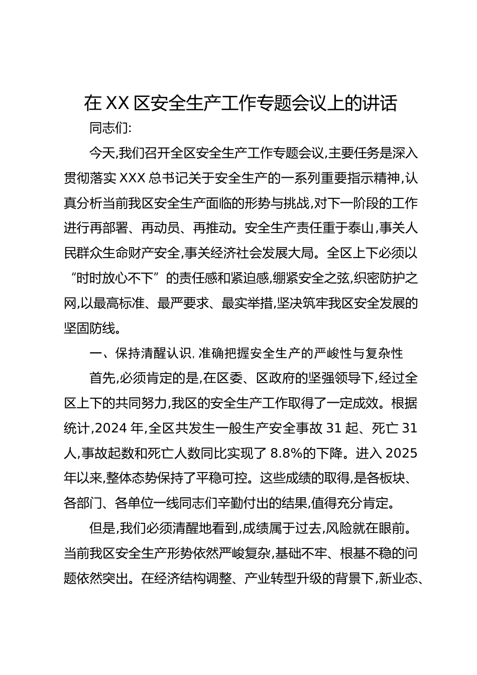 在XX區(qū)安全生產(chǎn)工作專題會議上的講話同志們:今天,我們召開全區(qū)安全生產(chǎn)工作專題會議,主要任務(wù)是深入貫徹落實XXX總書記關(guān)于安全生產(chǎn)的一系列重要指示精神,認真分析當前我區(qū)安全生產(chǎn)面臨的形勢與挑戰(zhàn),對下一階段的工作進行再部署、再動員、再推動。安全生產(chǎn)責(zé)任重于泰山,事關(guān)人民群眾生命財產(chǎn)安全,事關(guān)經(jīng)濟社會發(fā)展大局。全區(qū)上下必須以“時時放心不下”的責(zé)任感和緊迫感,繃緊安全之弦,織密防護之網(wǎng),以最高標準、最嚴要求、最實舉措,堅決筑牢我區(qū)安全發(fā)展的堅固防線。一、保持清醒認識,準確把握安全生產(chǎn)的嚴峻性與復(fù)雜性首先,必須肯定的是,在區(qū)委、區(qū)政府的堅強領(lǐng)導(dǎo)下,經(jīng)過...
