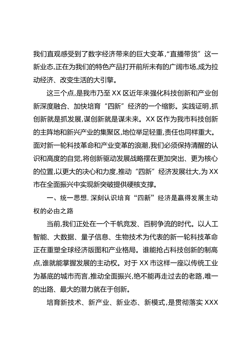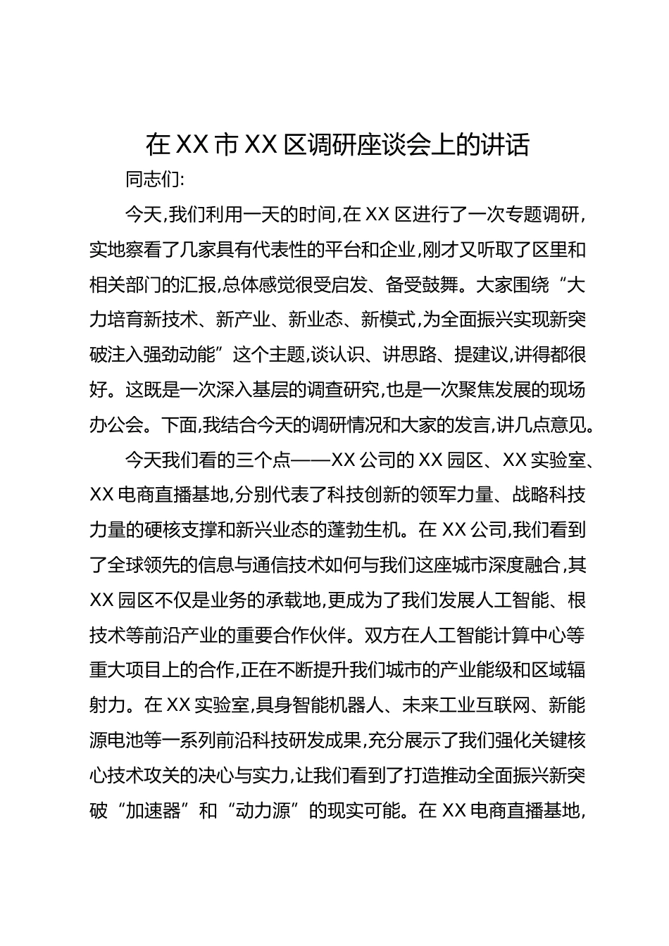 在XX市XX區(qū)調研座談會上的講話同志們:今天,我們利用一天的時間,在XX區(qū)進行了一次專題調研,實地察看了幾家具有代表性的平臺和企業(yè),剛才又聽取了區(qū)里和相關部門的匯報,總體感覺很受啟發(fā)、備受鼓舞。大家圍繞“大力培育新技術、新產業(yè)、新業(yè)態(tài)、新模式,為全面振興實現新突破注入強勁動能”這個主題,談認識、講思路、提建議,講得都很好。這既是一次深入基層的調查研究,也是一次聚焦發(fā)展的現場辦公會。下面,我結合今天的調研情況和大家的發(fā)言,講幾點意見。今天我們看的三個點——XX公司的XX園區(qū)、XX實驗室、XX電商直播基地,分別代表了科技創(chuàng)新的領軍力量、戰(zhàn)略科技力量的硬核...