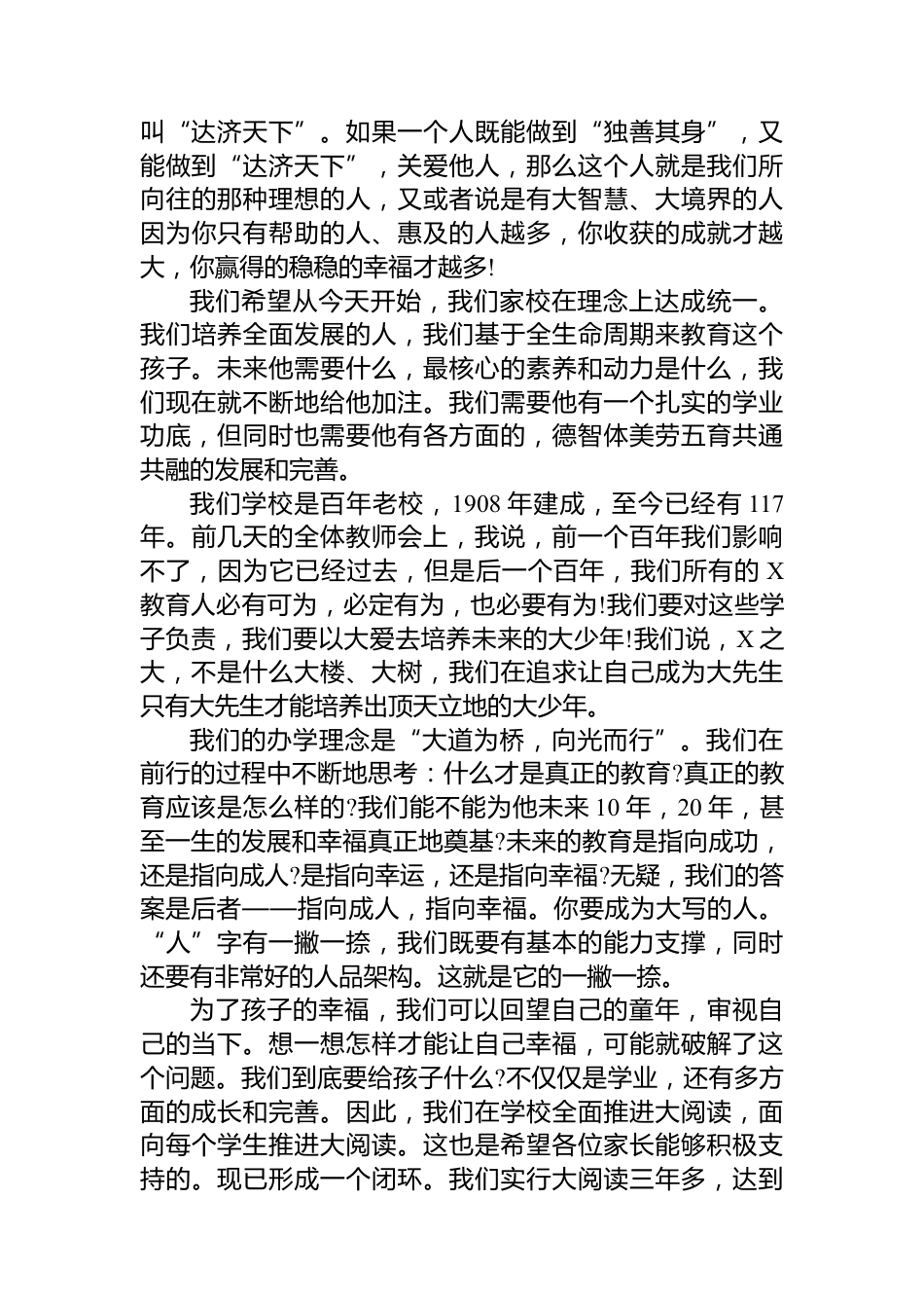 在XX小學(xué)2025新生入學(xué)家長(zhǎng)會(huì)上的發(fā)言:家庭教育五個(gè)“一”尊敬的各位家長(zhǎng),大家好!歡迎大家在百忙當(dāng)中抽出時(shí)間來參加今天的家長(zhǎng)會(huì)!這是一個(gè)值得銘記的日子。一方面對(duì)學(xué)校來講,我們又迎來了一批快樂的、可愛的、充滿希望的孩子,為我們學(xué)校增添了無窮的活力。另外一方面,對(duì)于各位家長(zhǎng),各個(gè)家庭來說,這是孩子夢(mèng)想起飛的時(shí)候,是他們?cè)谛碌钠脚_(tái)追逐新的夢(mèng)想的時(shí)候。在這重要的時(shí)刻,我們有必要在一起共同地溝通,更好地交心,讓這個(gè)生命起飛的姿態(tài)更好,未來獲得的幸福更多。各位家長(zhǎng)走進(jìn)學(xué)校,有沒有發(fā)現(xiàn)咱們學(xué)校在倡導(dǎo)什么?其實(shí),倡導(dǎo)什么從我們學(xué)校的綠化就可以看的...
