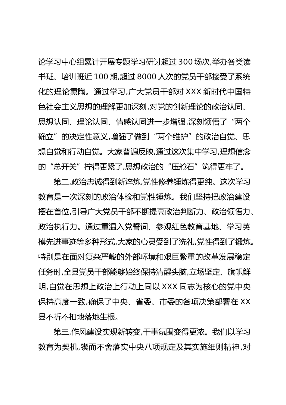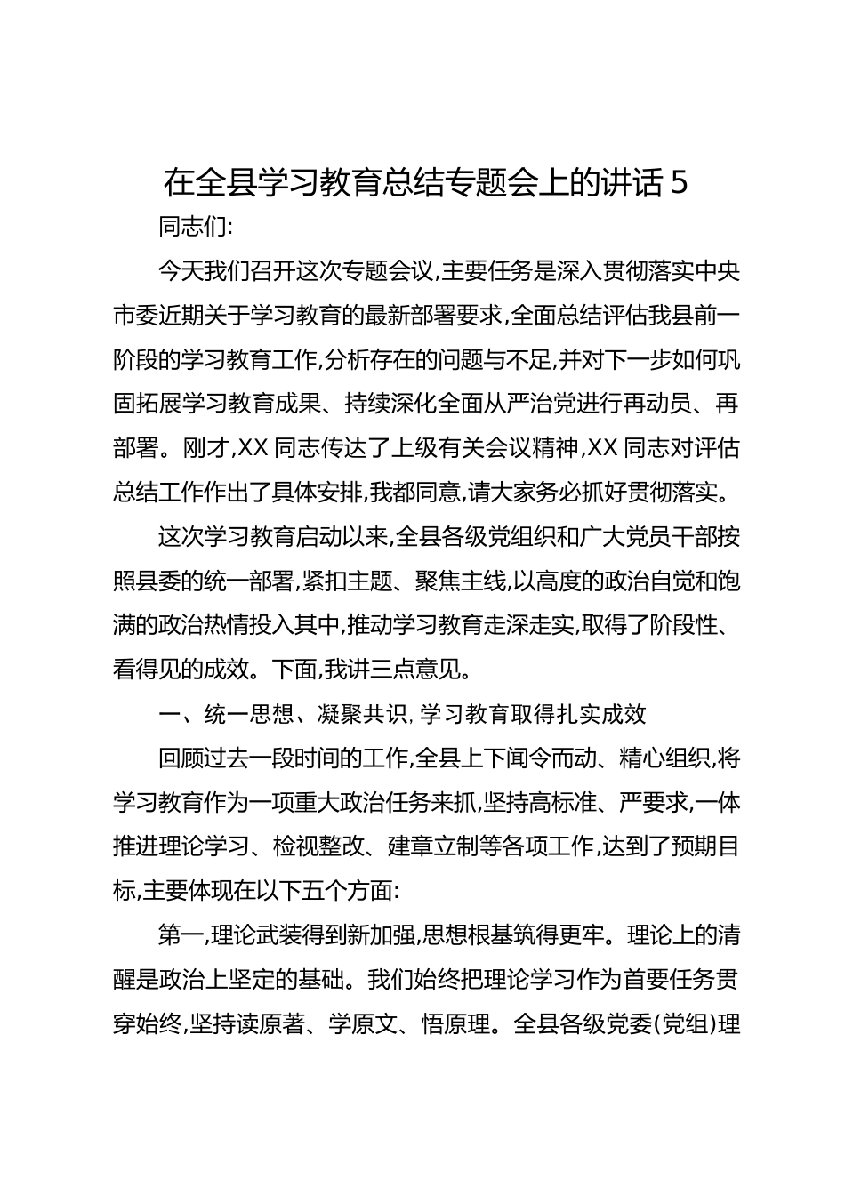 在全縣學習教育總結專題會上的講話5同志們:今天我們召開這次專題會議,主要任務是深入貫徹落實中央市委近期關于學習教育的最新部署要求,全面總結評估我縣前一階段的學習教育工作,分析存在的問題與不足,并對下一步如何鞏固拓展學習教育成果、持續(xù)深化全面從嚴治黨進行再動員、再部署。剛才,XX同志傳達了上級有關會議精神,XX同志對評估總結工作作出了具體安排,我都同意,請大家務必抓好貫徹落實。這次學習教育啟動以來,全縣各級黨組織和廣大黨員干部按照縣委的統(tǒng)一部署,緊扣主題、聚焦主線,以高度的政治自覺和飽滿的政治熱情投入其中,推動學習教育走深走實,取得了階段性、看...